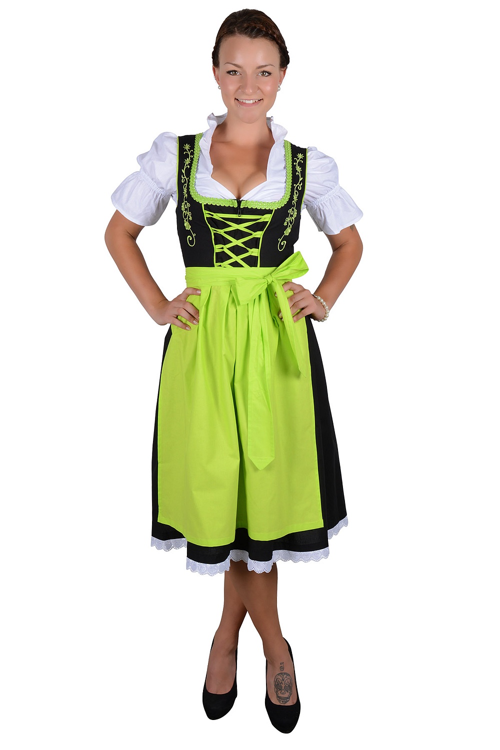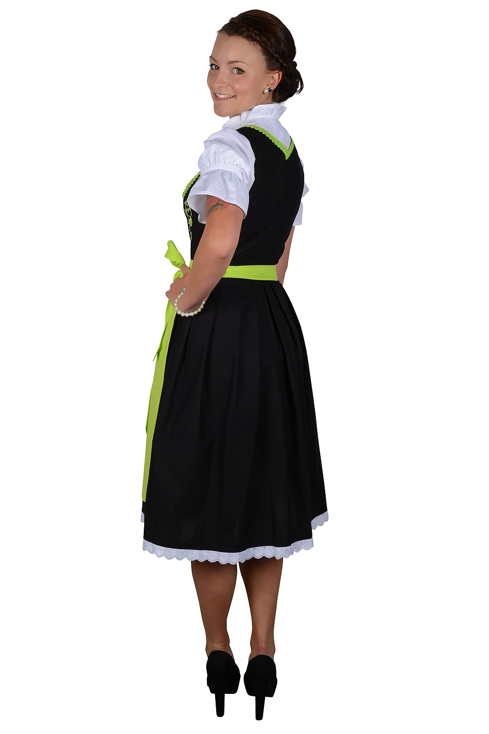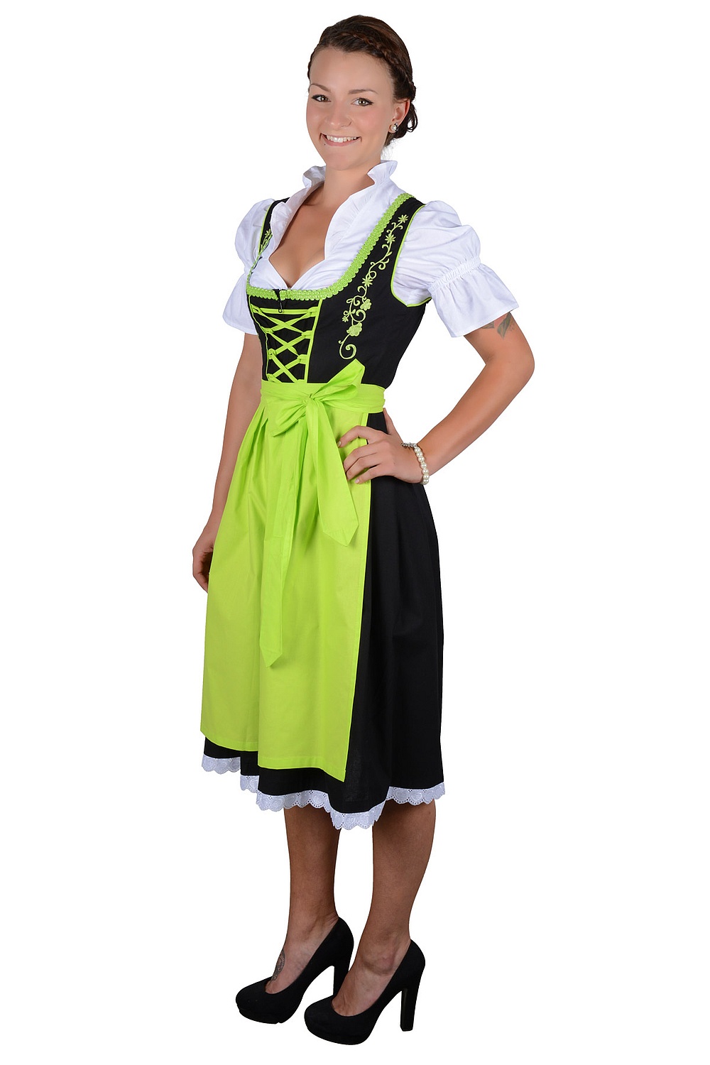 Fesches Midi Dirndl 3-teilig inklusive Bluse und Schürze. Dieses wunderschöne Dirndl begeistert durch seinen leuchtenden grün-ton in der die Schürze, die Schnürung, die aufwendige Stickerei und die hochwertige Borte am Ausschnitt gehalten sind. Der Rocksaum wird von einer süßen Herzchenborte geschmückt. Die Rüschen Dirndlbluse, welche mitgeliefert wird, kann im Ausschnitt individuell verstellt werden. Das Dirndl wird vorne mit einem Reissverschluss geschlossen und bietet somit optimalen Tragekomfort und bringt die weibliche Figur perfekt zur Geltung!