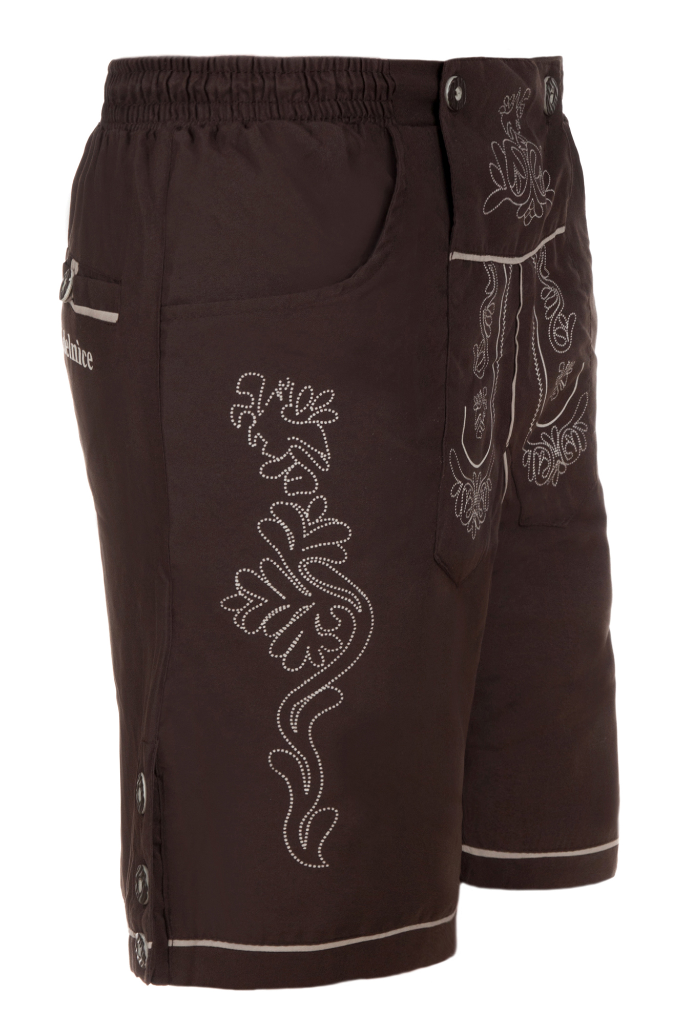 Hochwertige Trachtenknöpfe und eine aufgedruckte Trachtenstickerei machen den Lederhosen Look dieser Trachtenbadeshort perfekt!