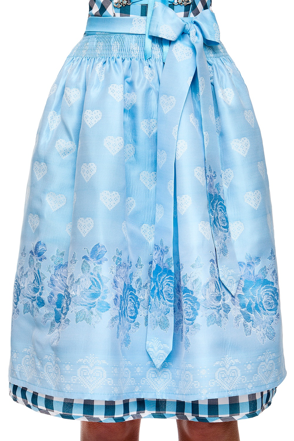 Strahlend schön! Romantisches Mididirndl für laue Sommernächte! Feminine Farben und ein Hauch von Glanz verzaubert jeden Betrachter! Der Reiz dieses Dirndls geht von der leuchtenden Dirndlschürze aus. Sie ist mit süßen Kreuzstichherzen und einer romantischen Rosenborte verziert. Kombiniert wird die Schürze zum Karodirndl. Rock und Mieder sind gleichmäßig in Karo gehalten. Das Mieder ist vorn über einen Reißverschluß zu öffnen und wird mit einem Satinband traditionell geschnürt. Miederösen und das gesamte Dekolleté sind mit umlaufenden Straßsteinchen veredelt. Sie verleihen dem Dirndl einen Hauch von Eleganz.
