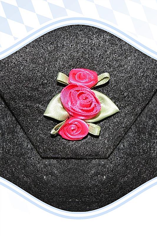 Auf dem Verschluss wurden 2 kleine und eine große rot-pink glänzende Satinrose angebracht.
