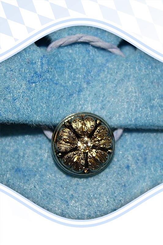 Die Dirndltasche wird mit einer blauen Kordel und einem schwarzen Knopf mit einem Swarovskistein mittig geschlossen.