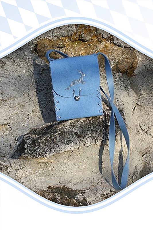 In Handarbeit gefertigte Filz Dirndl Umhängetasche in der Farbe hellblau.