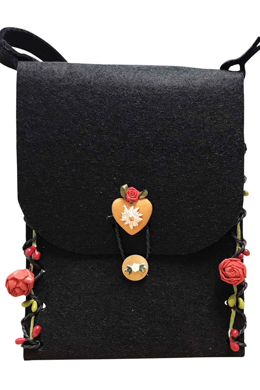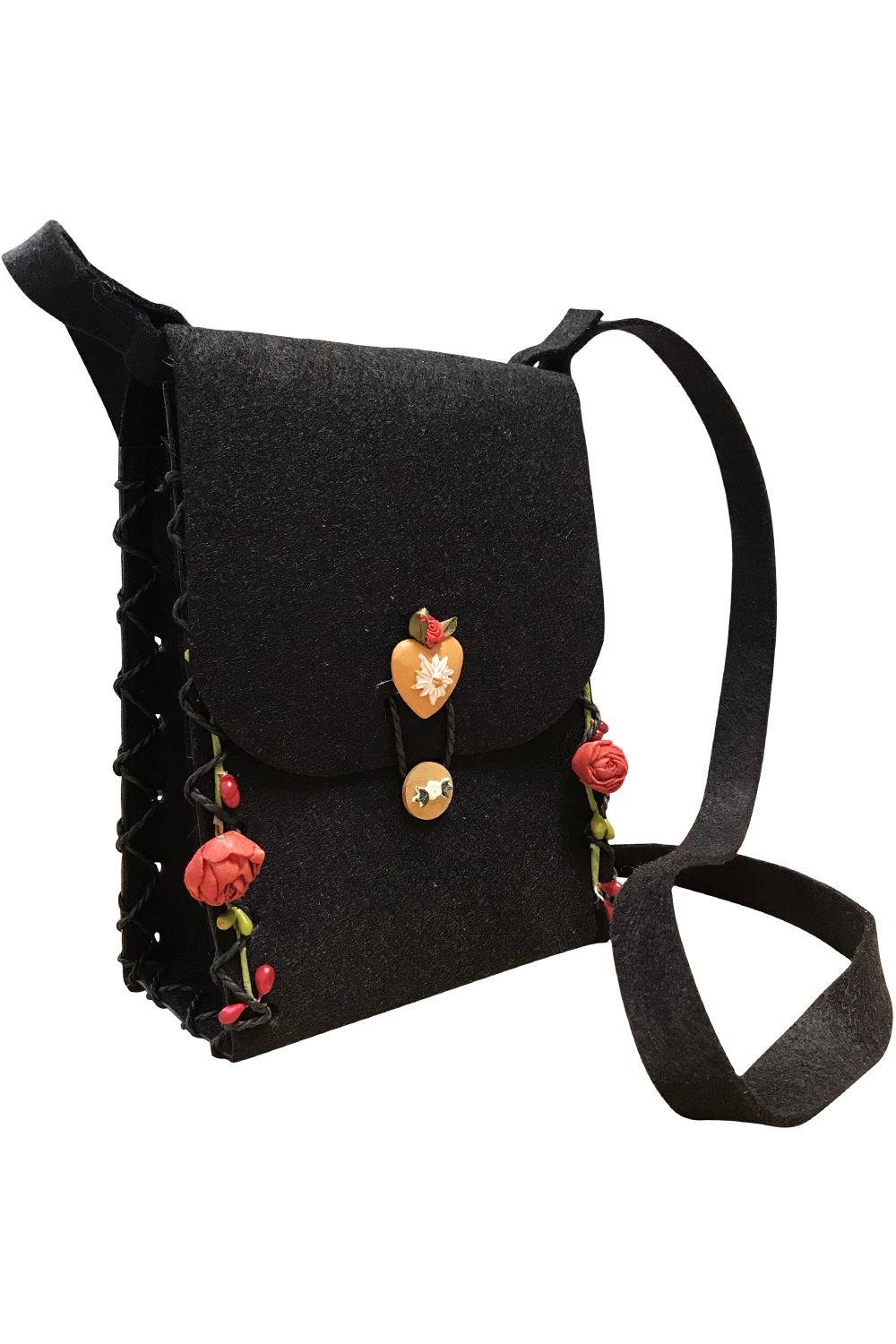 Per Hand gearbeitete Filz Dirndl Umhängetasche in der Farbe schwarz.