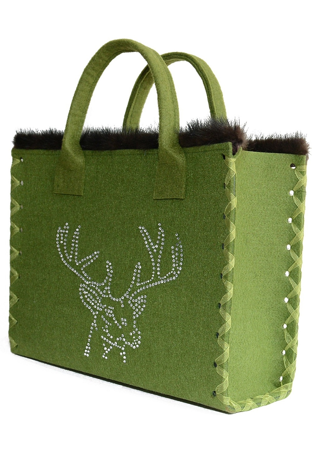 Vorne prangt ein wunderschöner Hirschkopf aus original Swarovski Steinen, oben ziert eine Pelzleiste aus echtem Nerz die Tasche, und bildet einen geschmackvollen Kontrast zur grünen Farbe der Tasche.