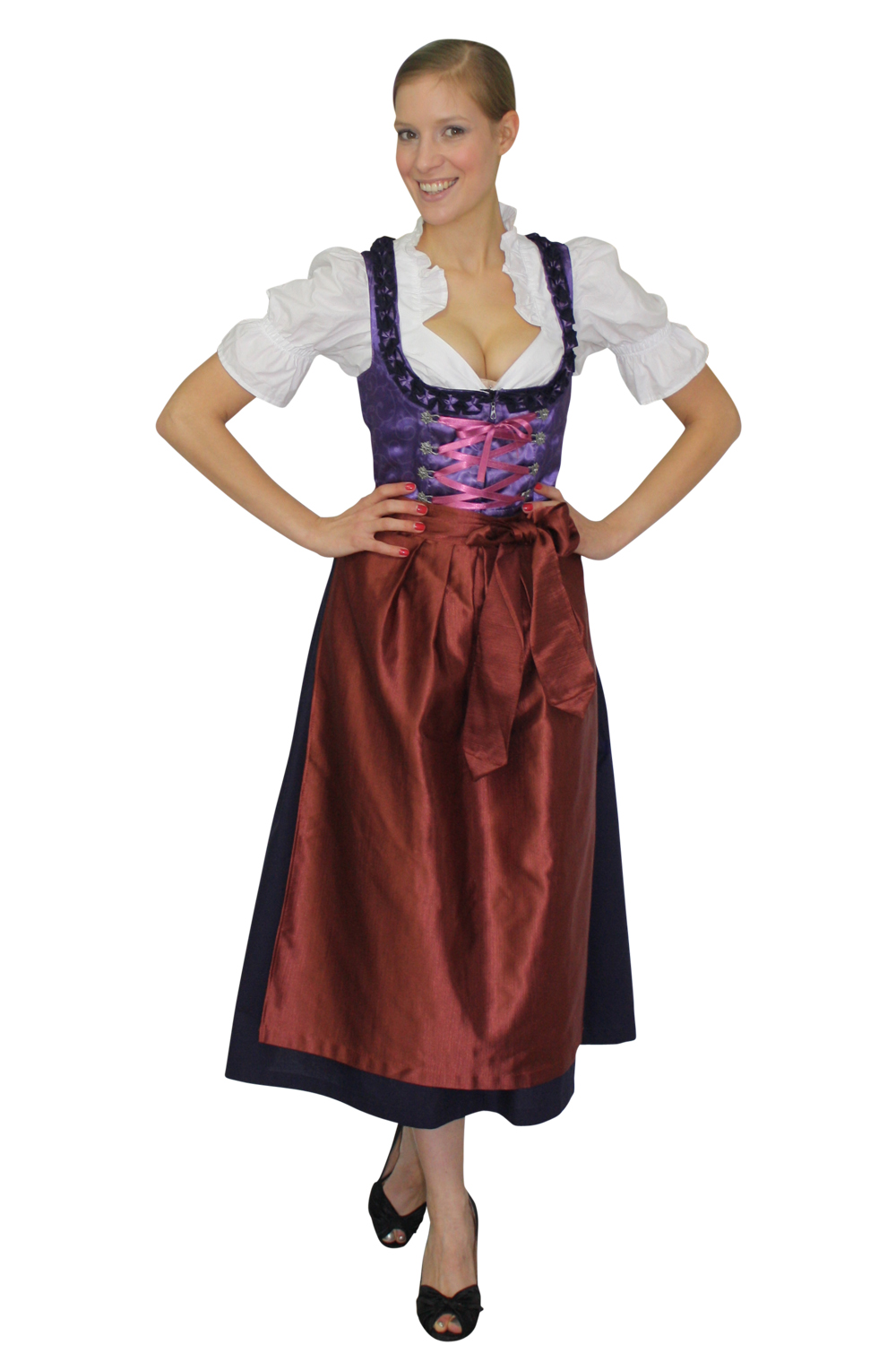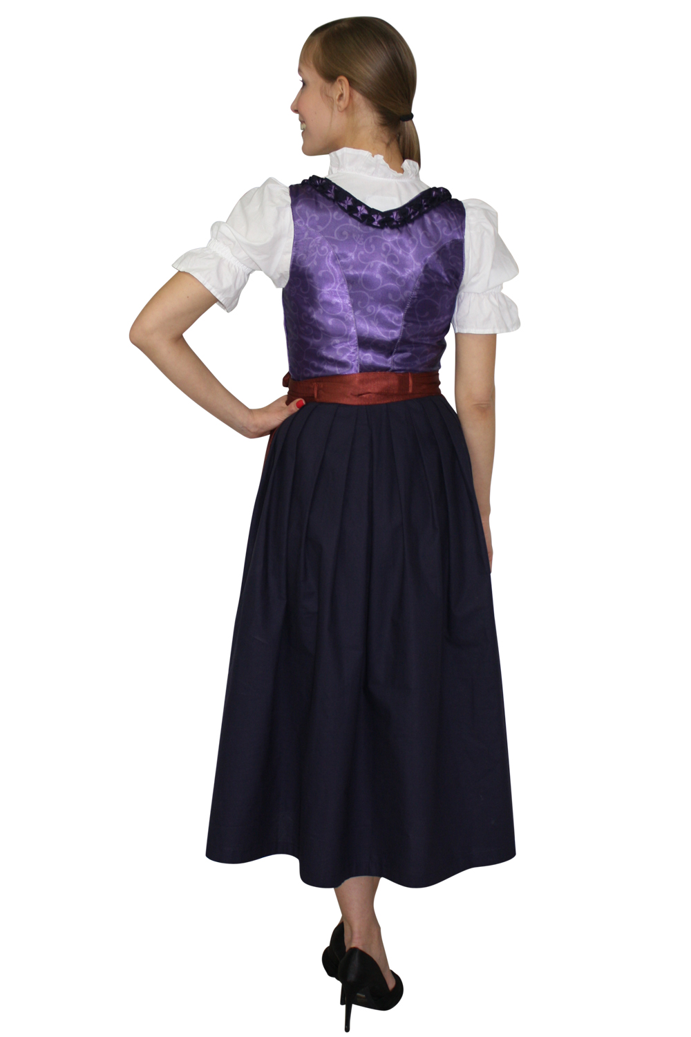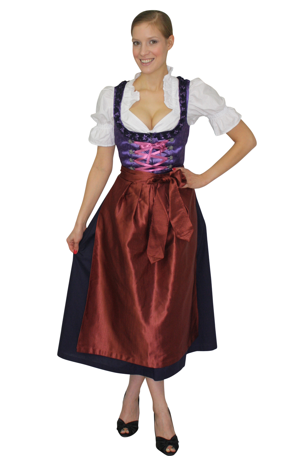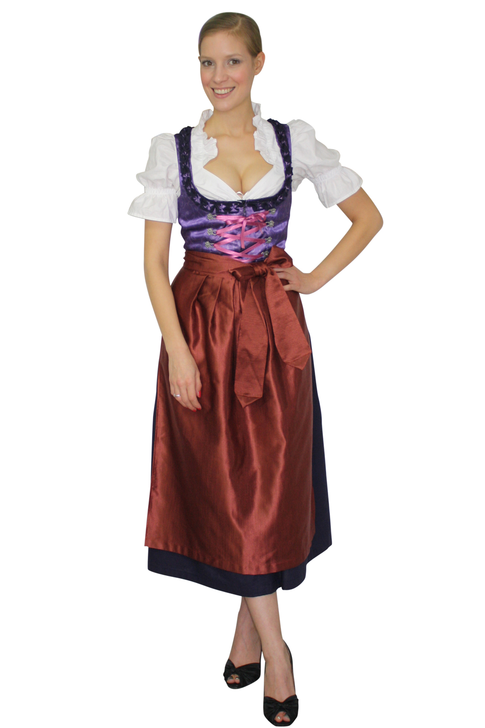 Wunderschönes Midi Dirndl 3-teilig in lila schwarz mit passender roter Dirndlschürze und weißer Rüschen Dirndlbluse