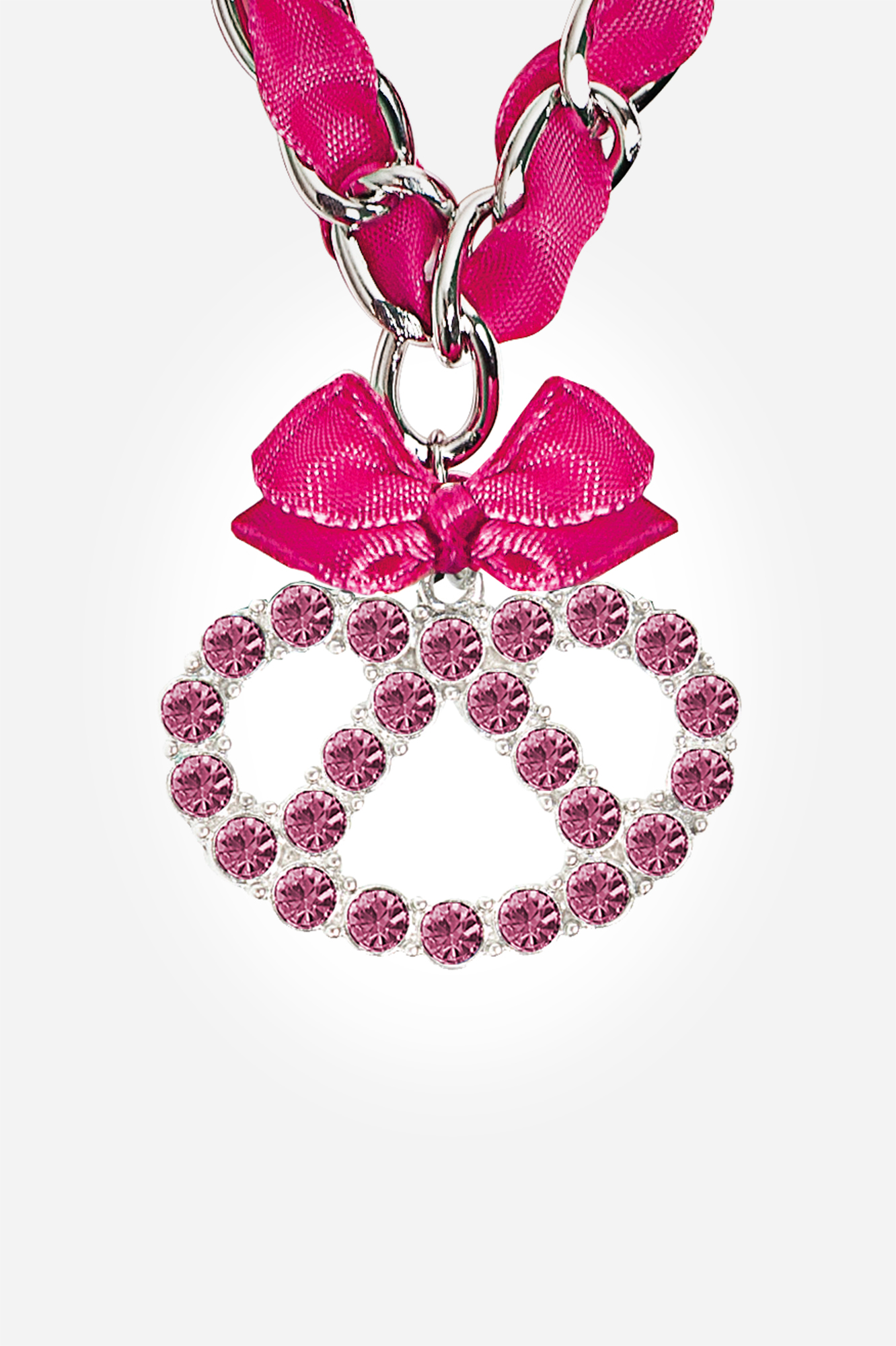 Die Kette hat eine Brezl und darüber eine pinke Satinschleife und ist das ideale Accessoire zum Dirndl oder auch zur Lederhose.