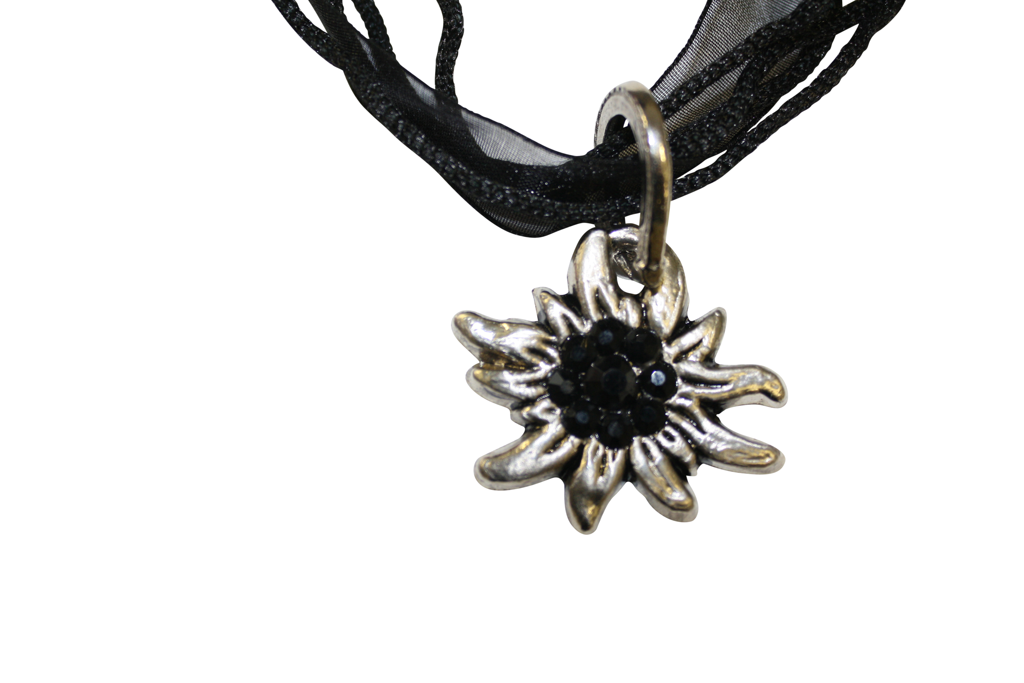 Süße Trachtenhalskette mit schwarzem Band und Edelweiß Anhänger mit schwarzen Strass- Steinchen