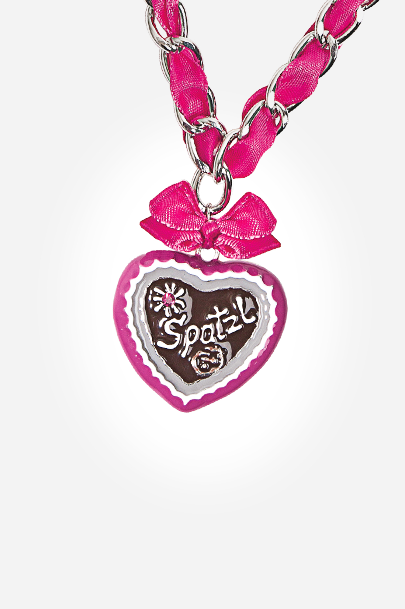 Die Herz-Kette mit dem Schriftzug Spatzl und pinke Satinschleife ist das ideale Accessoire zum Dirndl oder auch zur Lederhose.