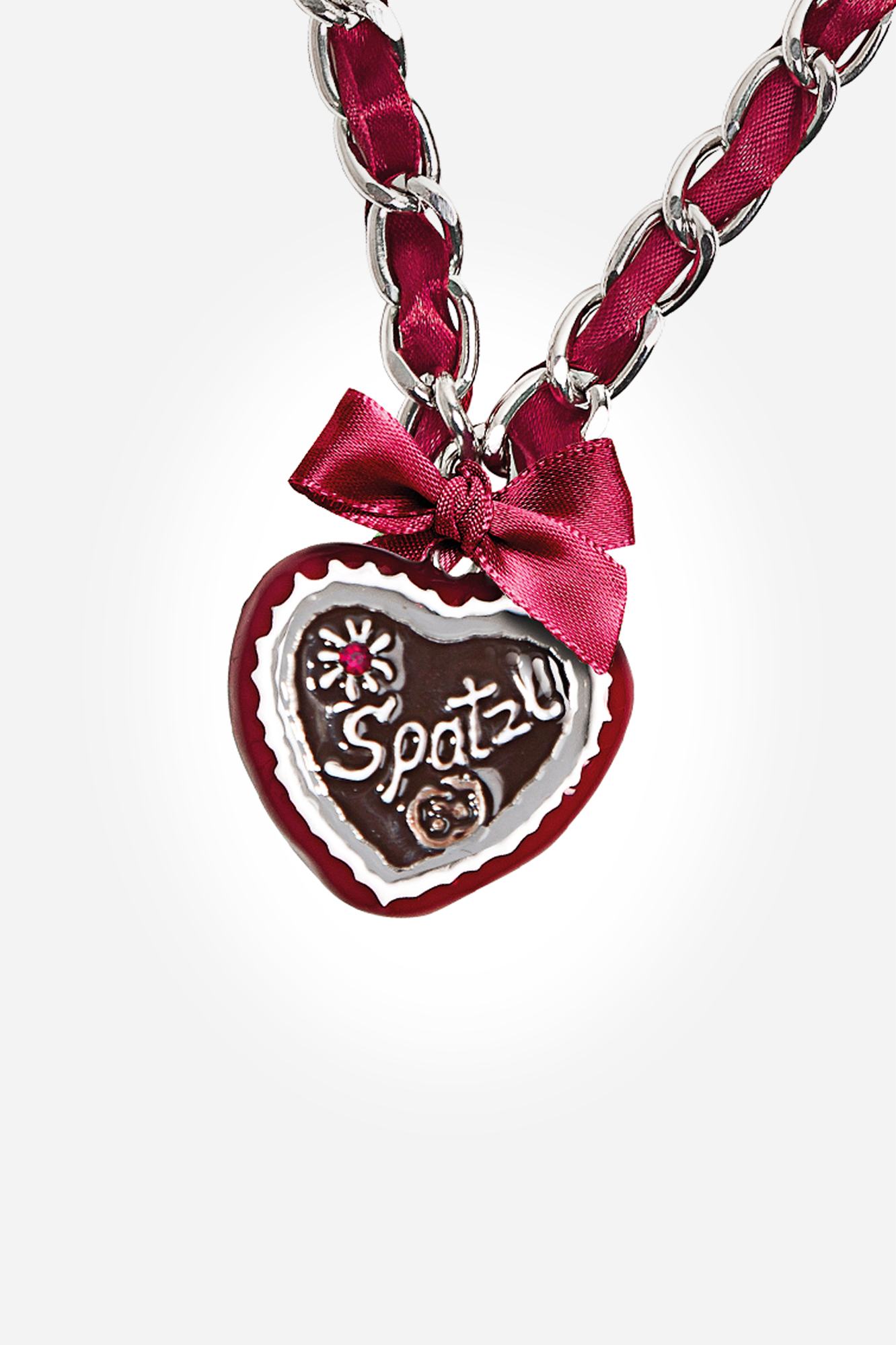 Die Herz-Kette mit dem Schriftzug Spatzl und bordeauxrote Satinschleife ist das ideale Accessoire zum Dirndl oder auch zur Lederhose.