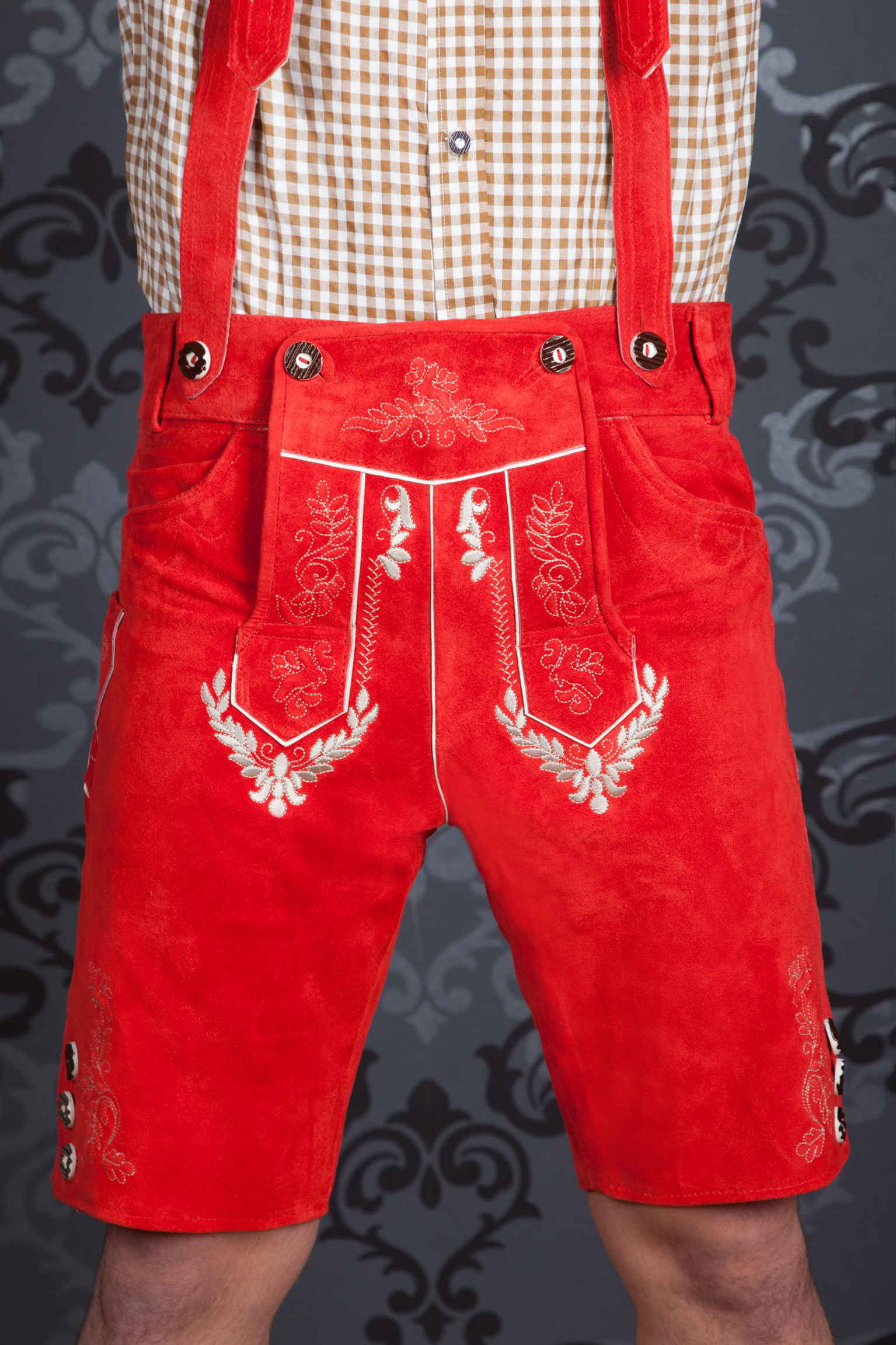Das Leder wird nach kurzem Tragen butterweich, schmiegt sich perfekt an den Körper an und bietet somit ultimativen Tragekomfort und Bewegungsfreiheit. Diese Lederhose werden Sie nie wieder ausziehen wollen! Passend zum stylishen Rotton wird die Hose mit einer exklusiven creme-gold schimmernden Stickerei veredelt. Die hochwertige Stickerei wird durch weiße Paspeln nochmal hervorgehoben. Wunderschöne Knöpfe in Hirschhornoptik zieren den Latz sowie die Gesäßtasche und dienen zur Befestigung der Hosenträger. Mit Lederbändern kann die Lederhose hinten am Bund und am Beinende individuell auf ihren Körper angepasst werden. Die Trachtenlederhose hat 2 Taschen vorne und eine Gesäßtasche. Zur Trachtenlederhose werden passend die Hosenträger mitgeliefert, welche Sie individuell auf Ihre Größe einstellen können Die Hose ist auch als Kniebund erhältlich! Schnappen Sie sich jetzt dieses Trendteil, neidische Blicke werden Ihnen damit garantiert sein!
