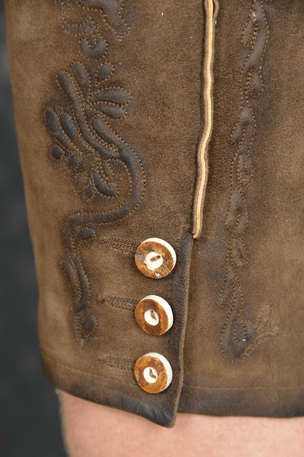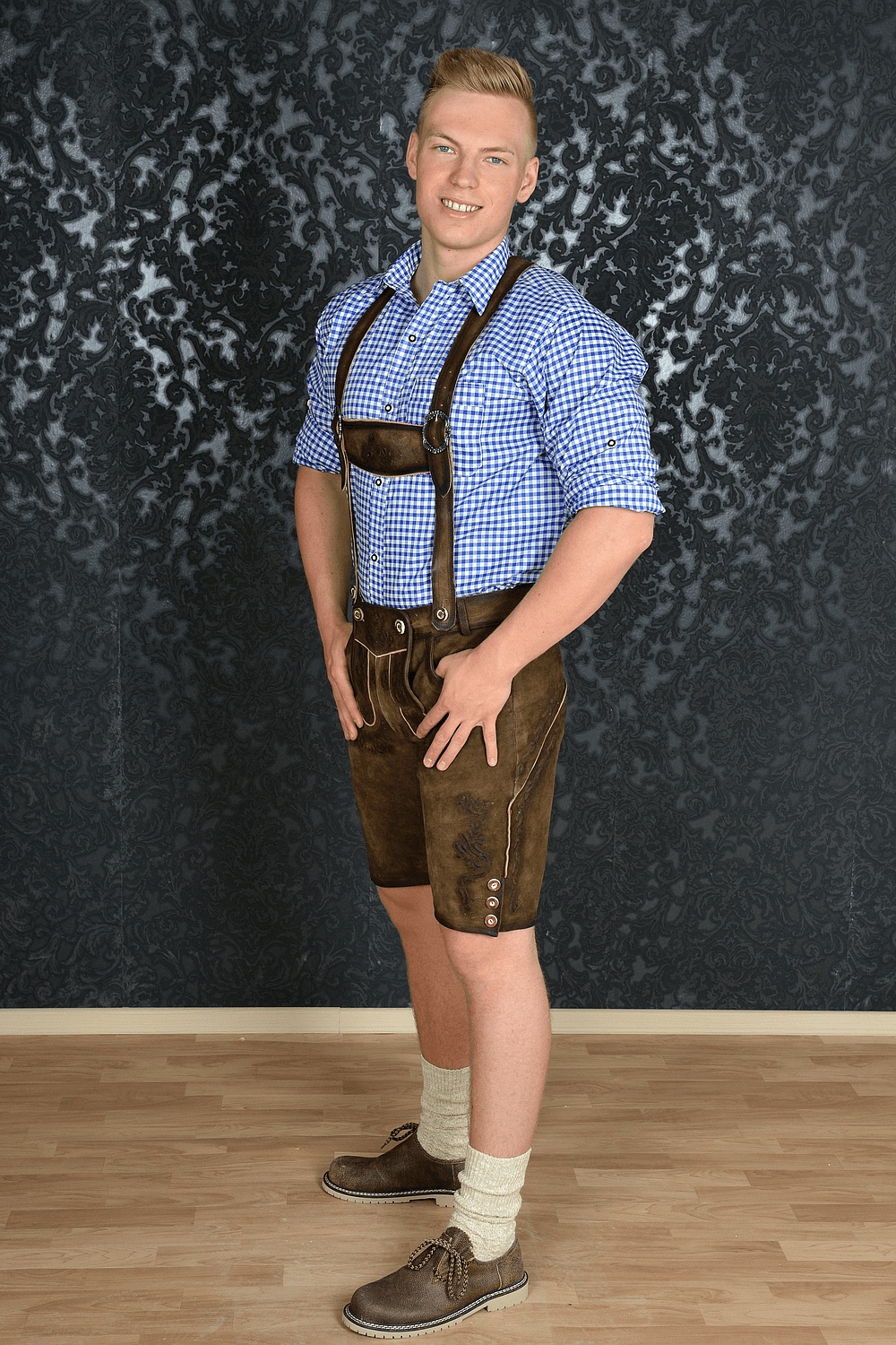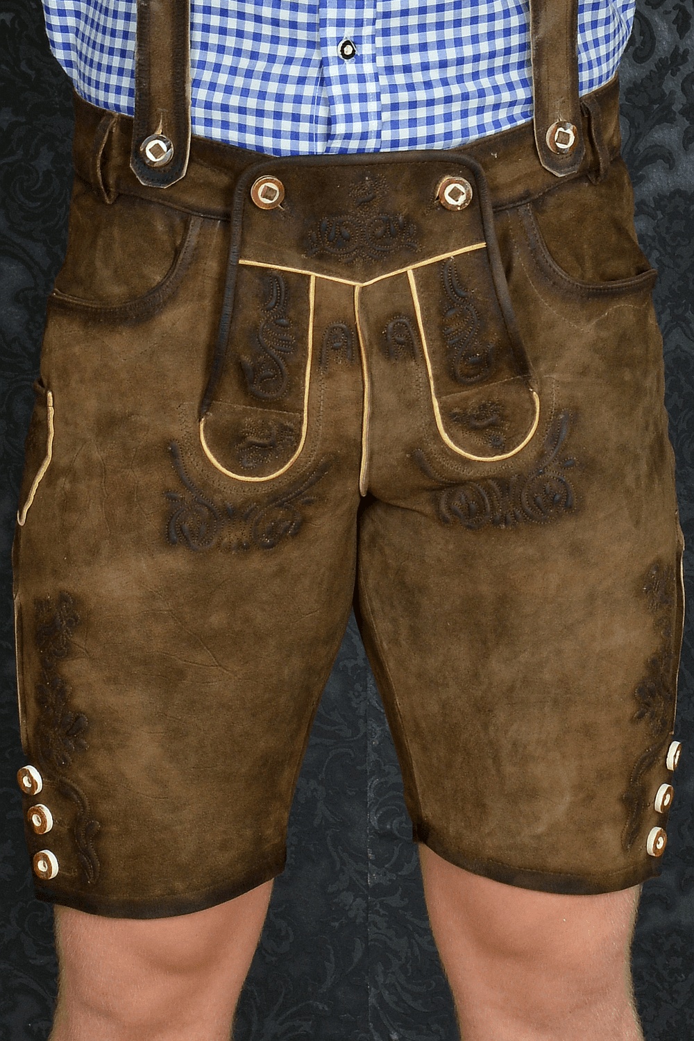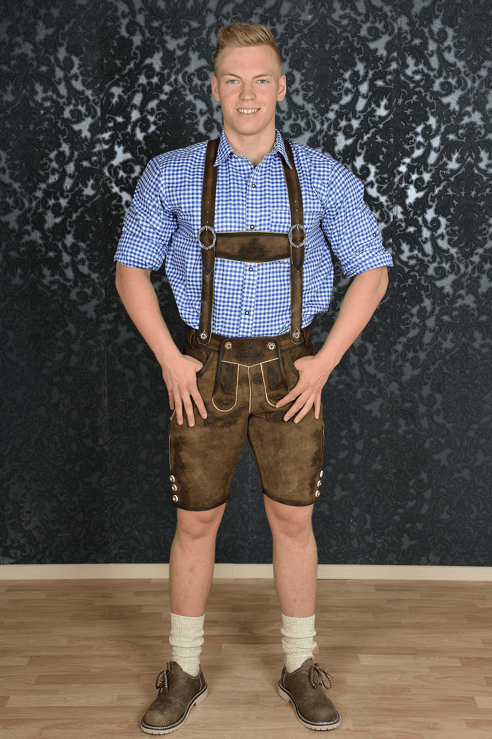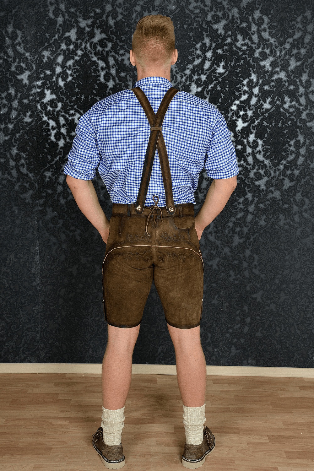 Hochwertige Trachtenknöpfe schließen den Latz. Im Lieferumfang enthalten sind außerdem passende Hosenträger, die individuell auf Ihre Größe eingestellt werden können.