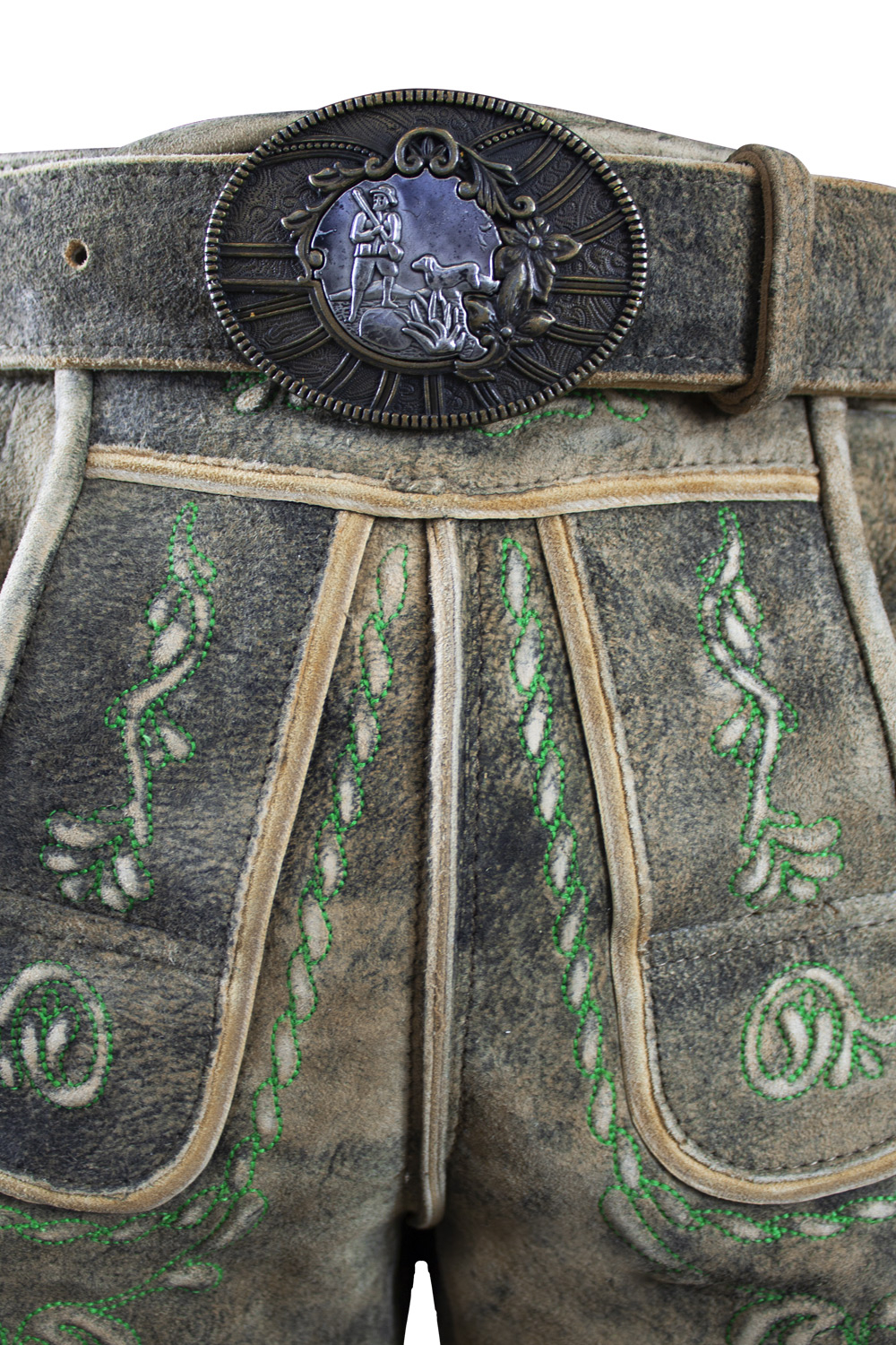 Mitgeliefert wird der passende Trachtengürtel. Die zweifarbige Schließe wird von einem aufwendig gearbeiteten Jäger Motiv geziert.