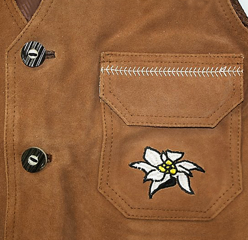 Auf der rechten Brusttassche befindet sich eine typisch bayerische Edelweiß Stickerei.