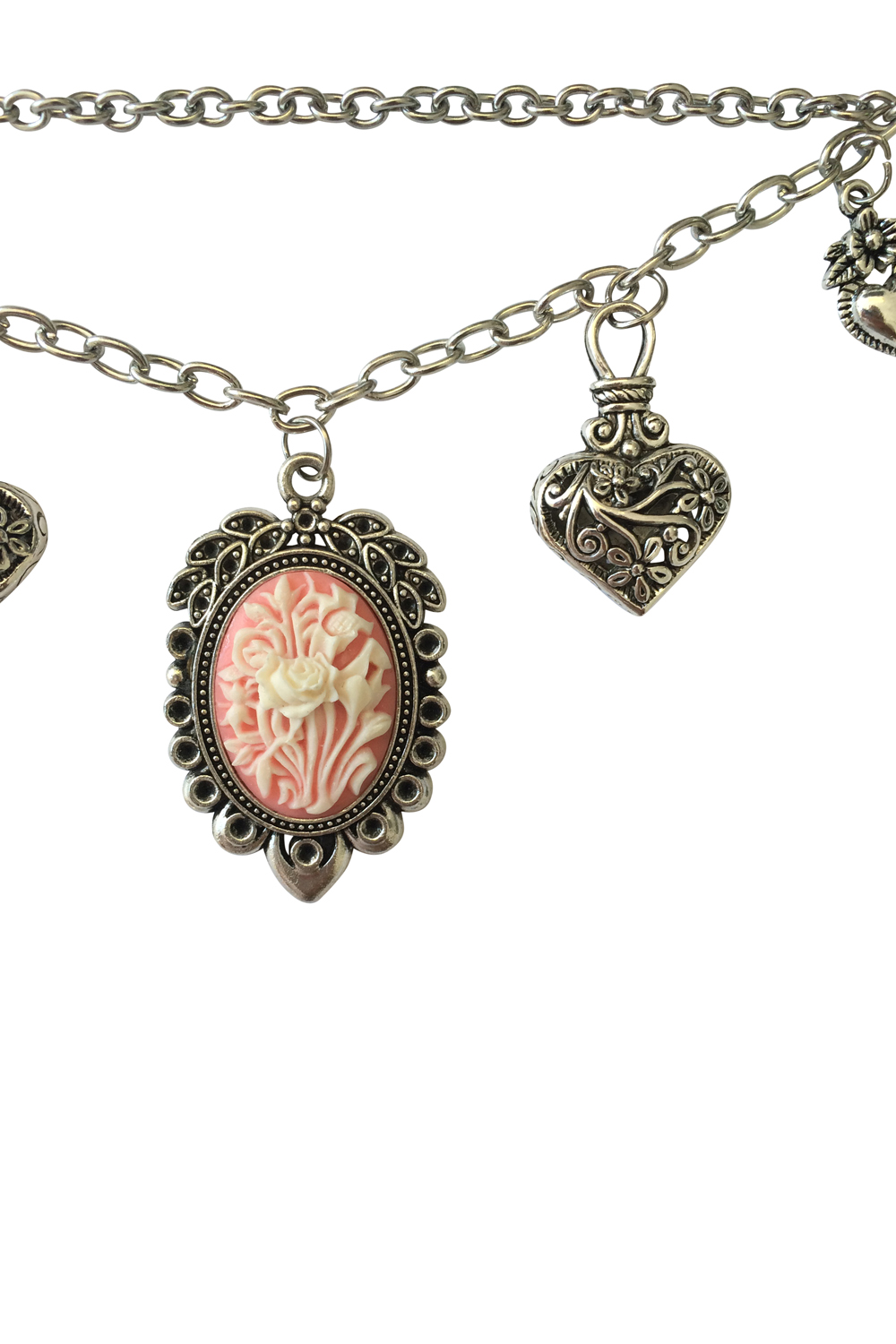 Es wird von Herzchen Anhängern geschmückt, die Mitte ziert ein Medaillon mit einem weiß-rosa Rosen-Kamee.
