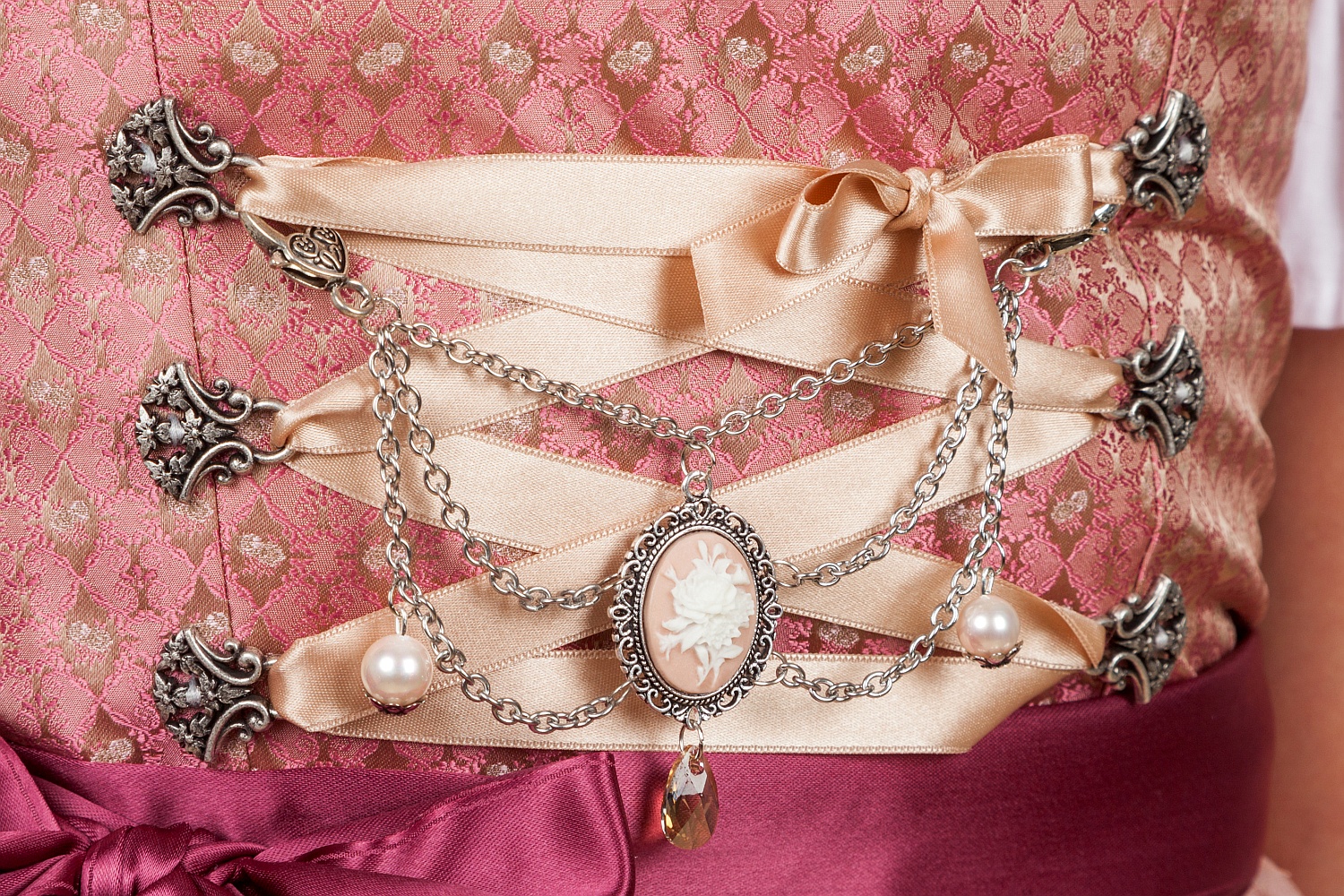 Mit Herzchen-Karabinerhaken kann das Charivari an den Miederhaken des Dirndls festgemacht werden.