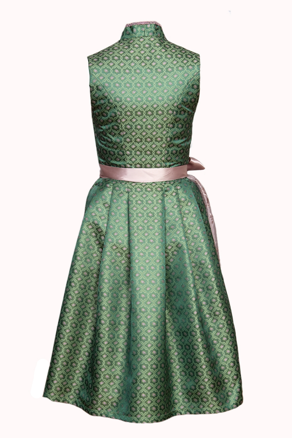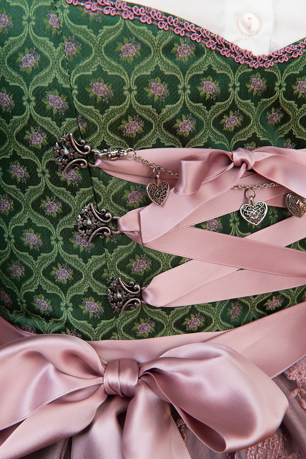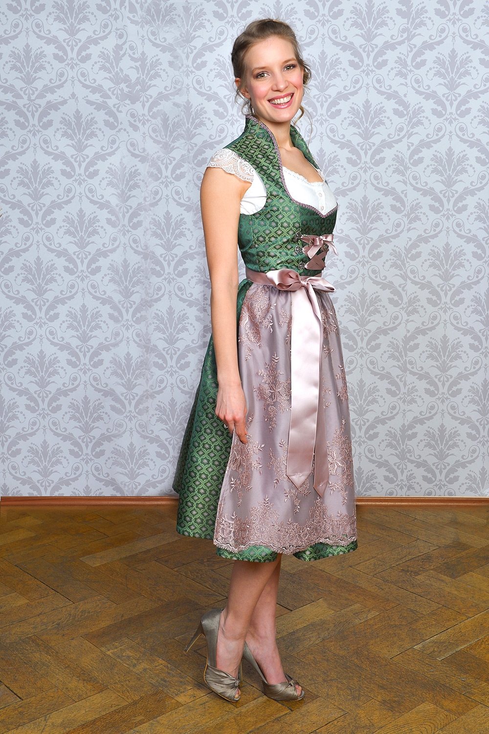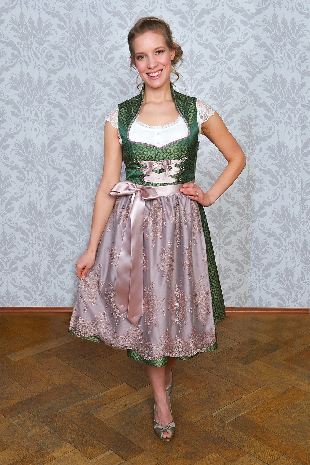 Durch den eleganten Stehkragen Schnitt wirkt das Dirndl besonders edel und feminin. In Kombination mit dem intensiv grünen Jaquard Stoff, welcher von rosa Röschen geziert wird, ergibt sich ein besonders frischer Look. Dazu harmoniert die Dirndlschürze perfekt - aus edler Spitze, mit einem changierdenen Stoff unterlegt. Der Ausschnitt und Kragen wird von einer zarten Borte in alt-rosa geschmückt.