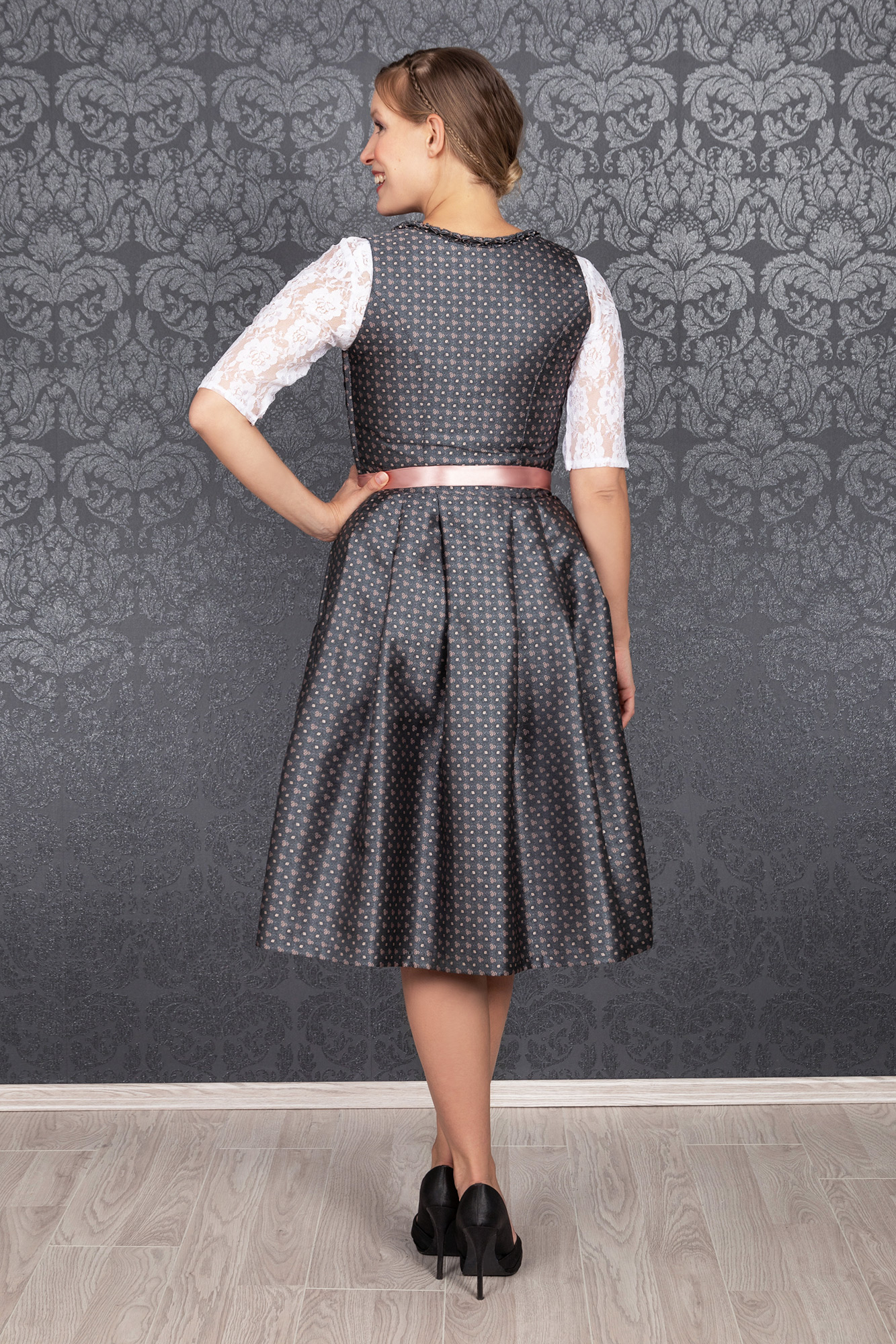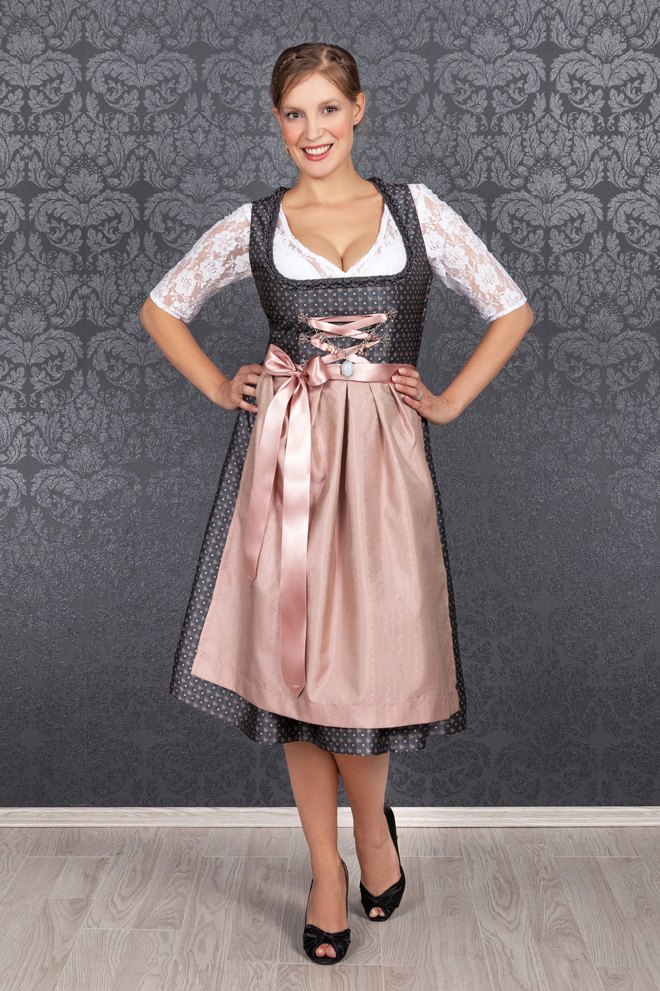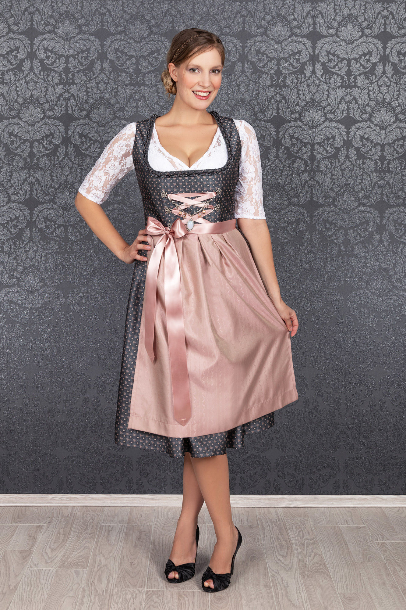 Auch dieses Jahr wieder absolut "In" sind schlichte, traditionelle Dirndl, die trotzdem modisch sind und beweisen, dass weniger oft mehr ist. So wurde unser bezauberndes Midi Dirndl Melina zeitlos schön aus einem hochwertigen Brokatstoff in dunkelgrau mit rosé farbenen Streublumen Muster gefertigt.