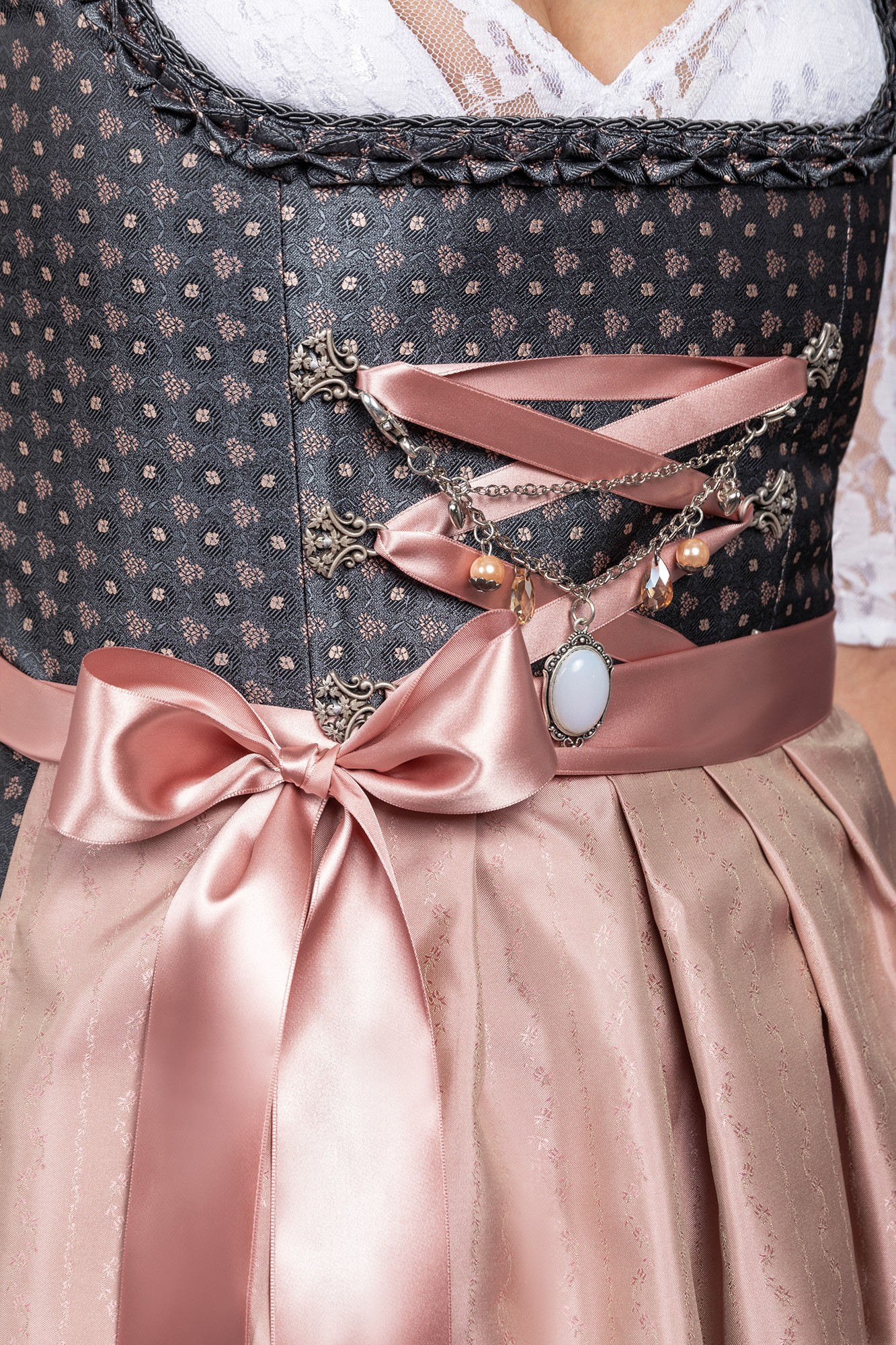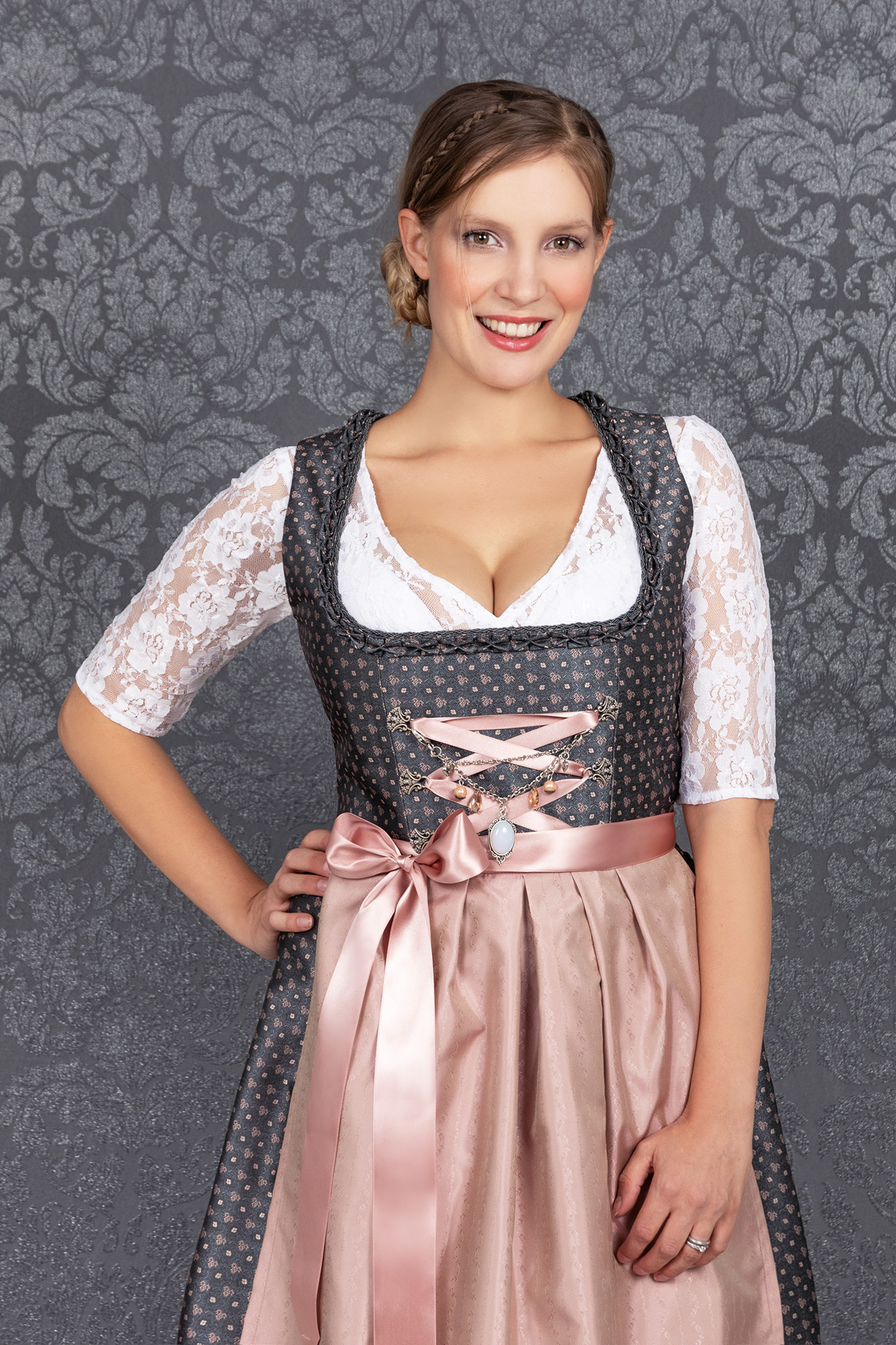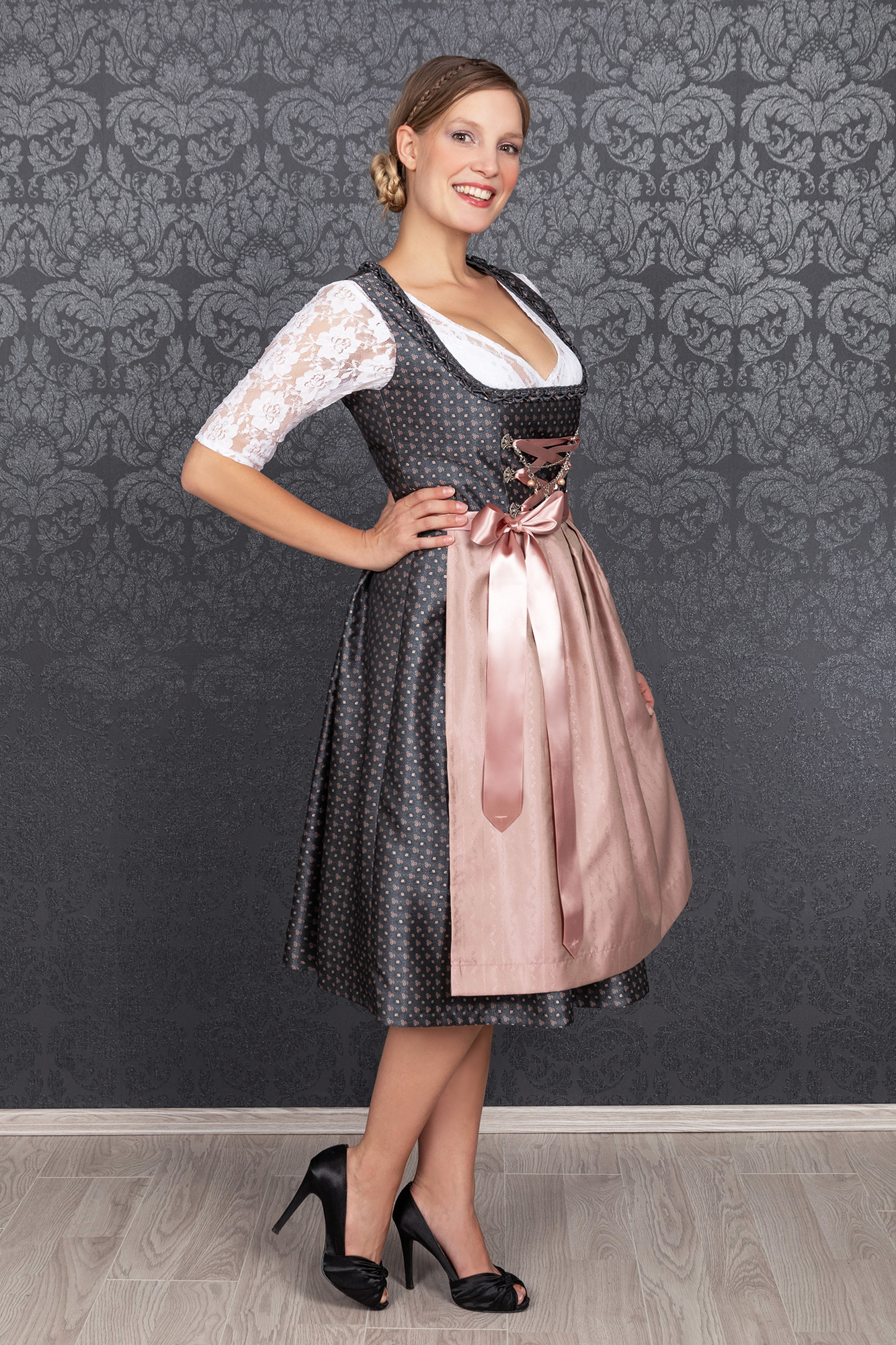 Auch dieses Jahr wieder absolut "In" sind schlichte, traditionelle Dirndl, die trotzdem modisch sind und beweisen, dass weniger oft mehr ist. So wurde unser bezauberndes Midi Dirndl Melina zeitlos schön aus einem hochwertigen Brokatstoff in dunkelgrau mit rosé farbenen Streublumen Muster gefertigt.