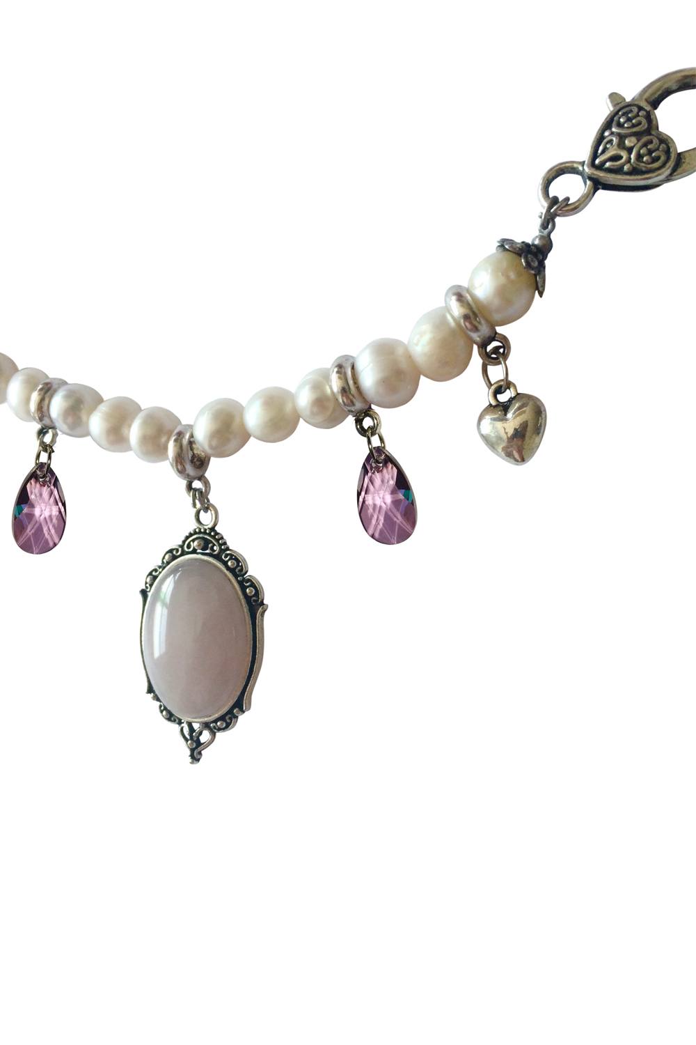Auf edler Perlenseide sind echte Süßwasserperlen aufgereiht. Geschmückt wird es von einem ovalen Medaillon Anhänger mit echtem Rosenquarz sowie 2 funkelnden Swarovski-Tropfen und 2 kleinen Herzchen.
