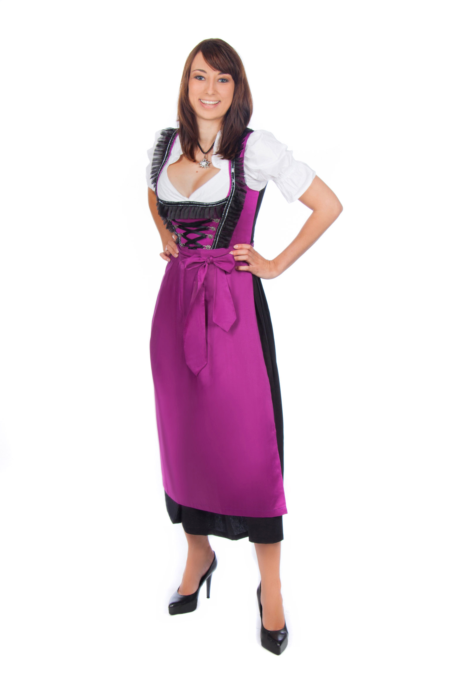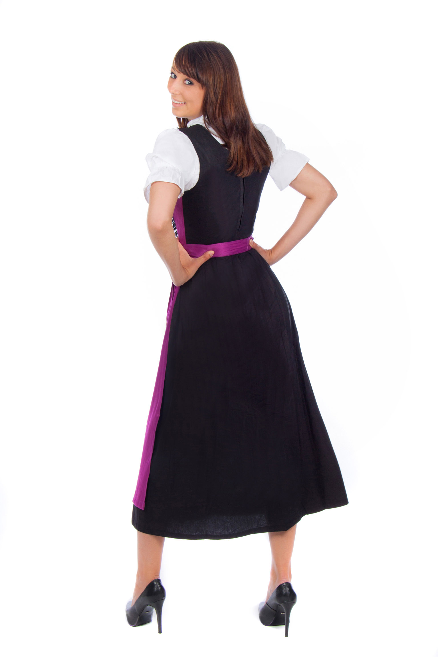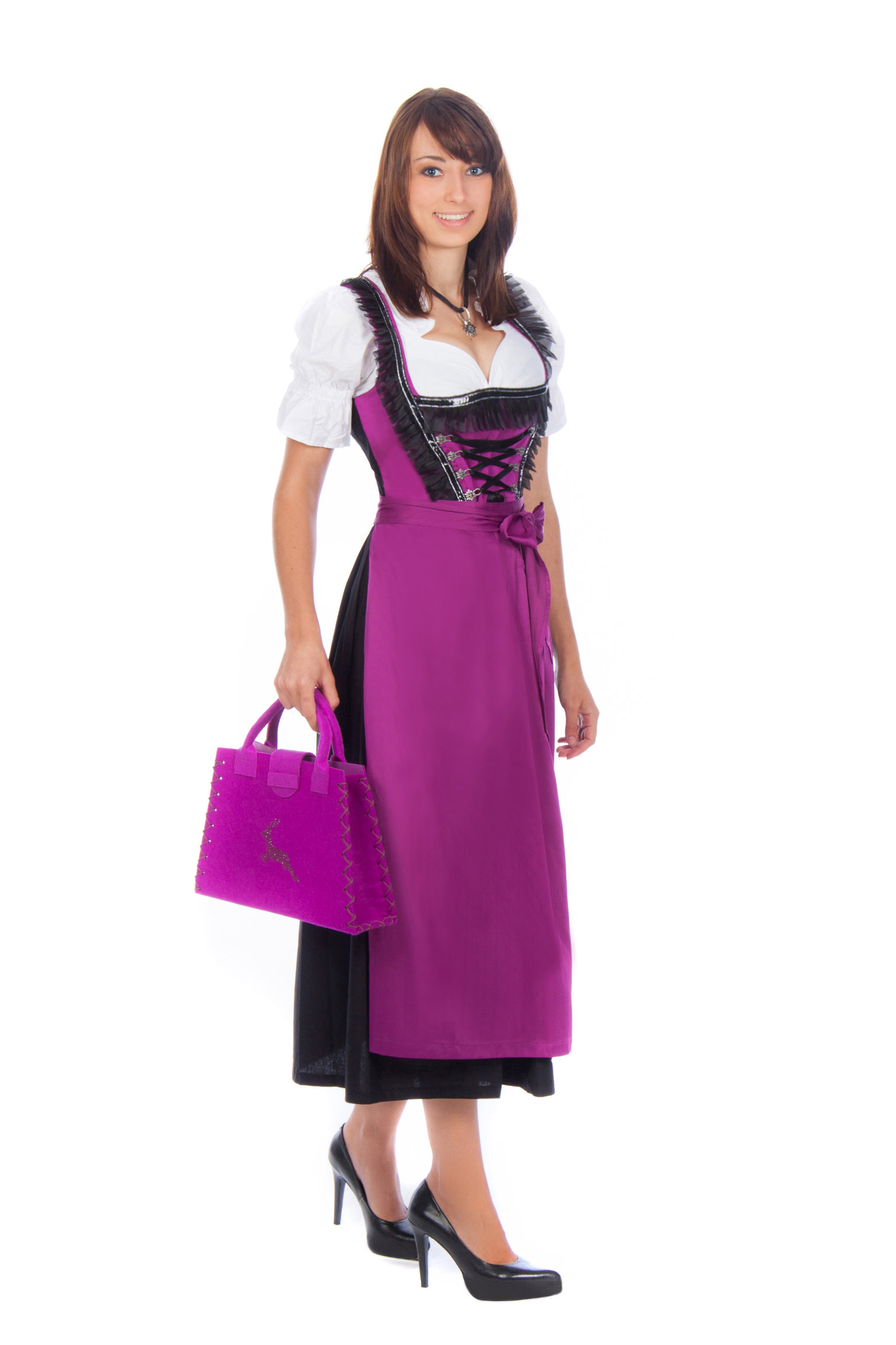 Der schwarze Rock und die violett farbene Dirndl Schürze sind in Falten gelegt.