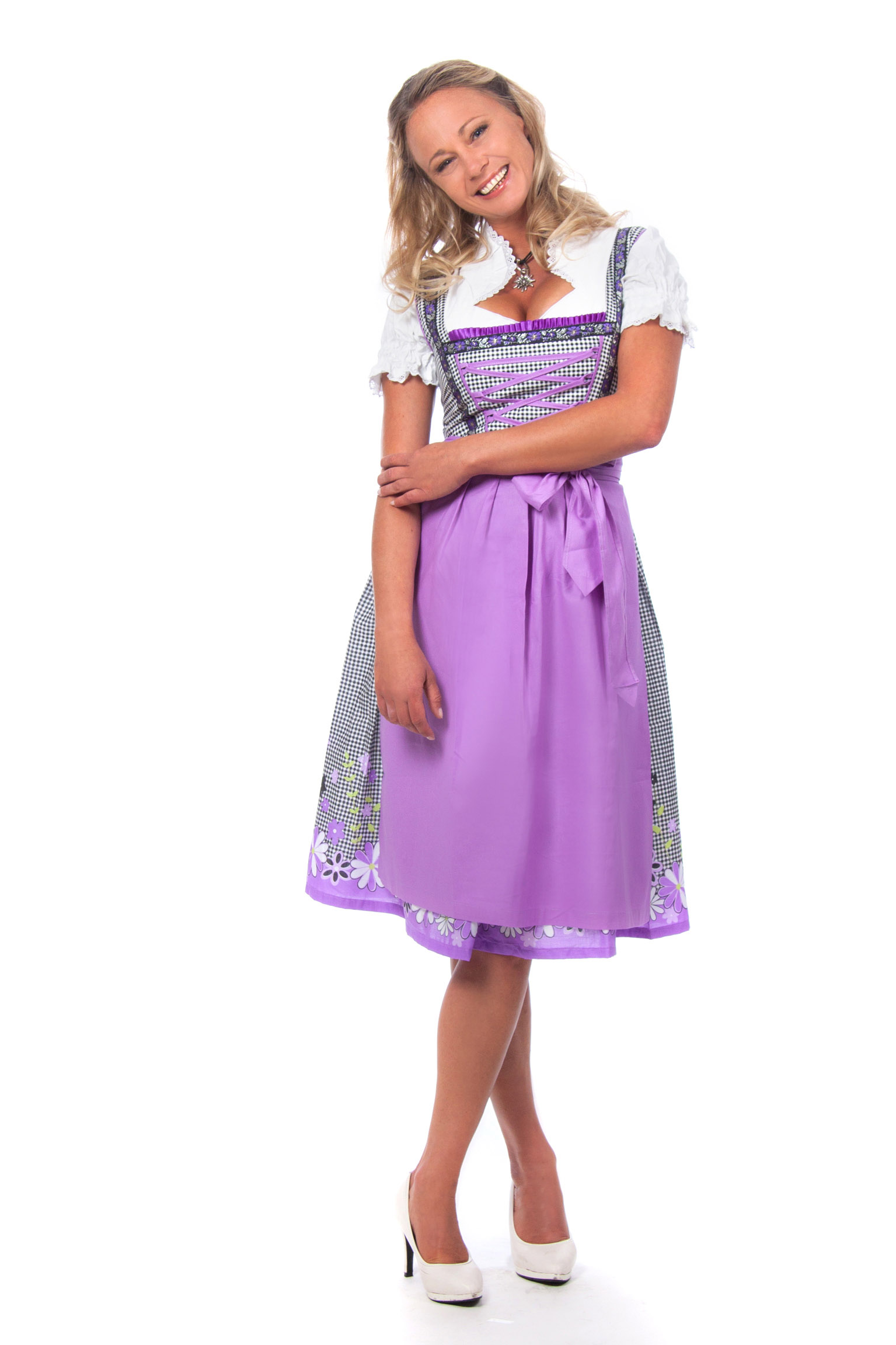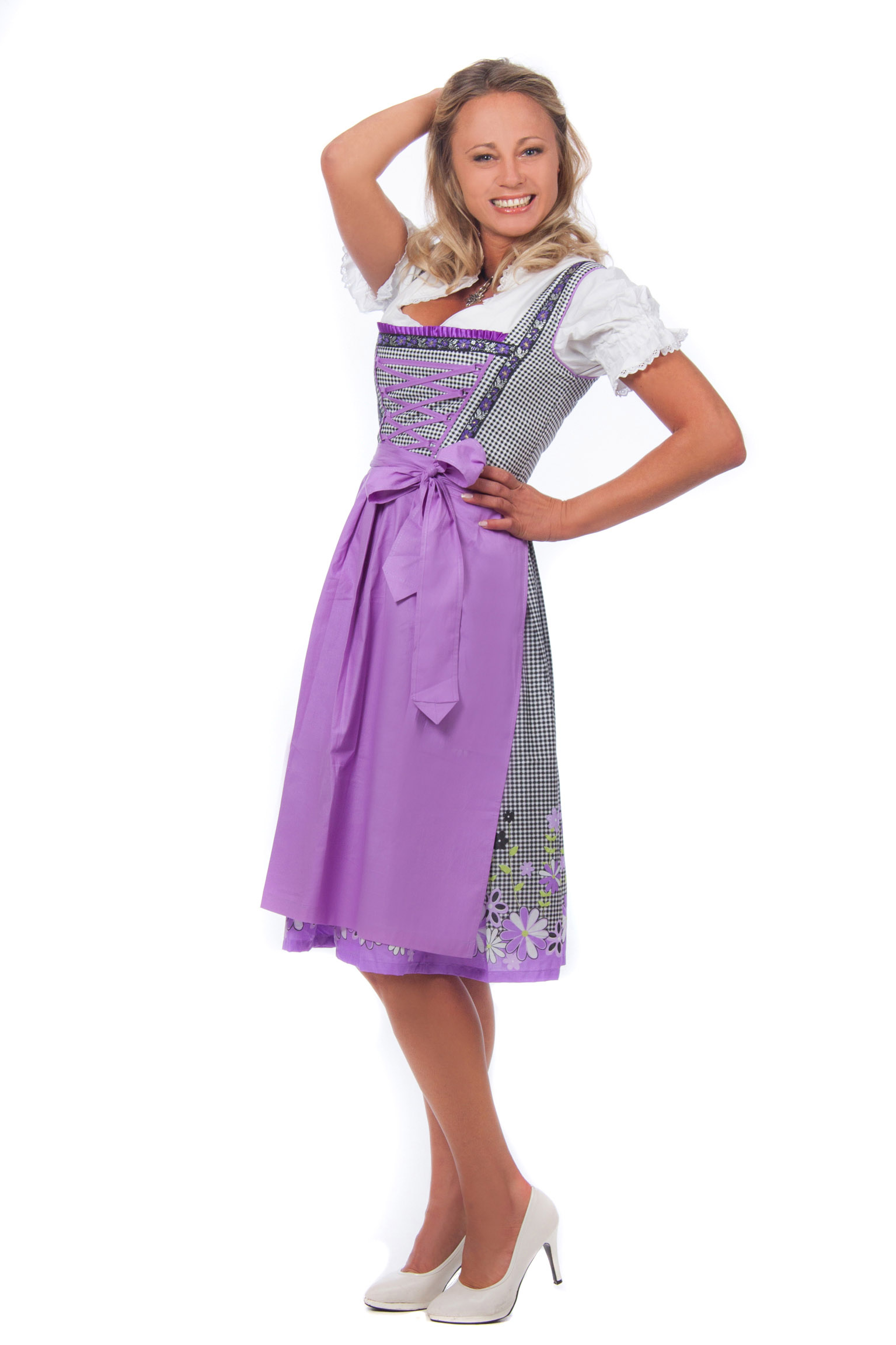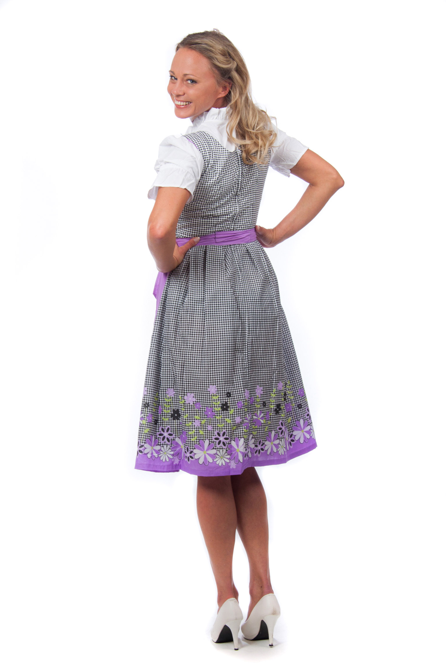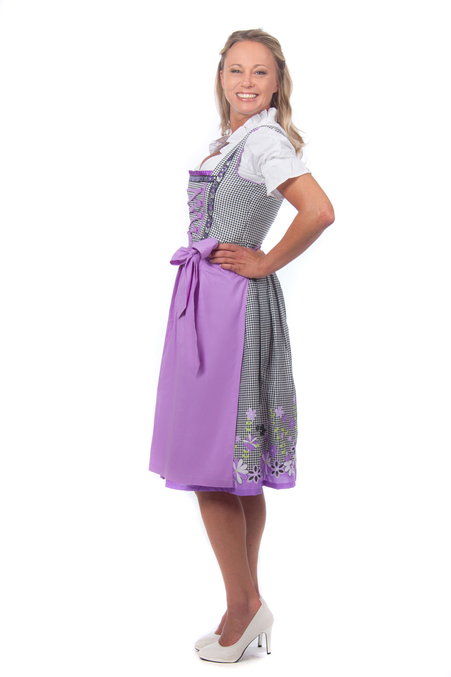 Wunderschönes Midi Dirndl 3-teilig in schwarz-weiß kariert mit passender lila Dirndlschürze und weißer Rüschen Dirndlbluse