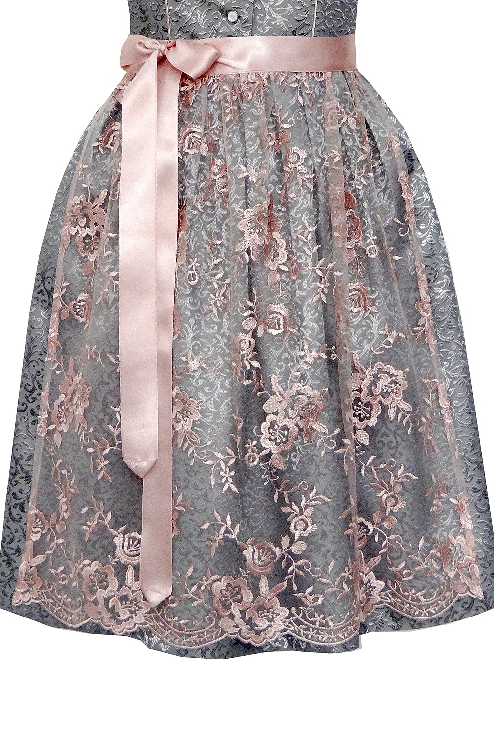 Das Set besteht aus einem grauen Dirndlkleid mit vorderseitiger Knopfleiste und einer aufwendig verarbeiteten rosa Spitzenschürze.