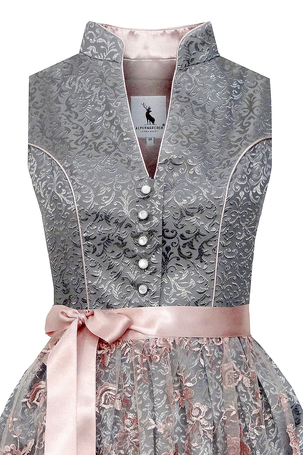 Dieses klassische Midi Dirndl aus der exklusiven Kollektion von Alpenmärchen besticht durch seinen raffinierten Schnitt und seine hübsche Farbgebung in grau und altrosa.