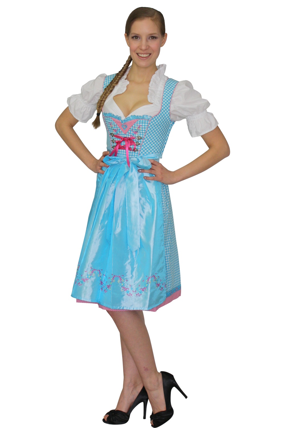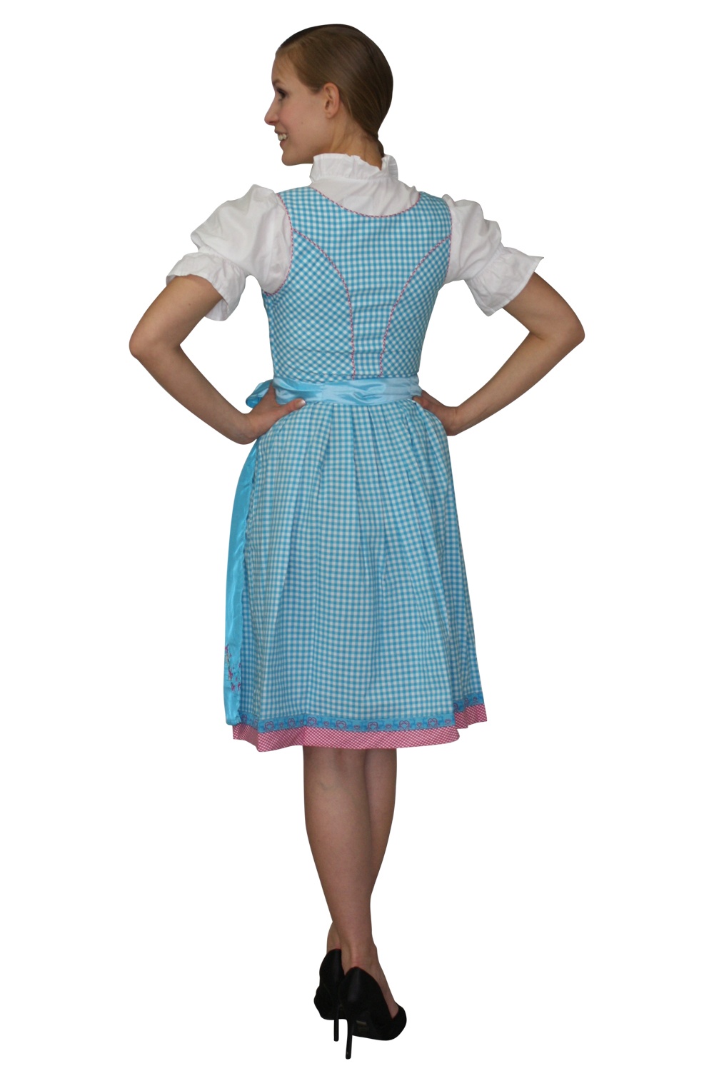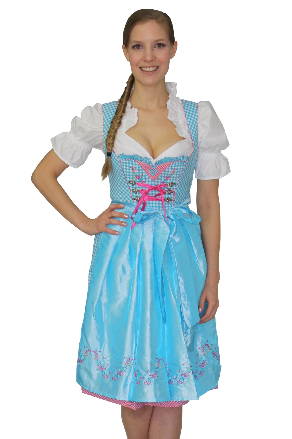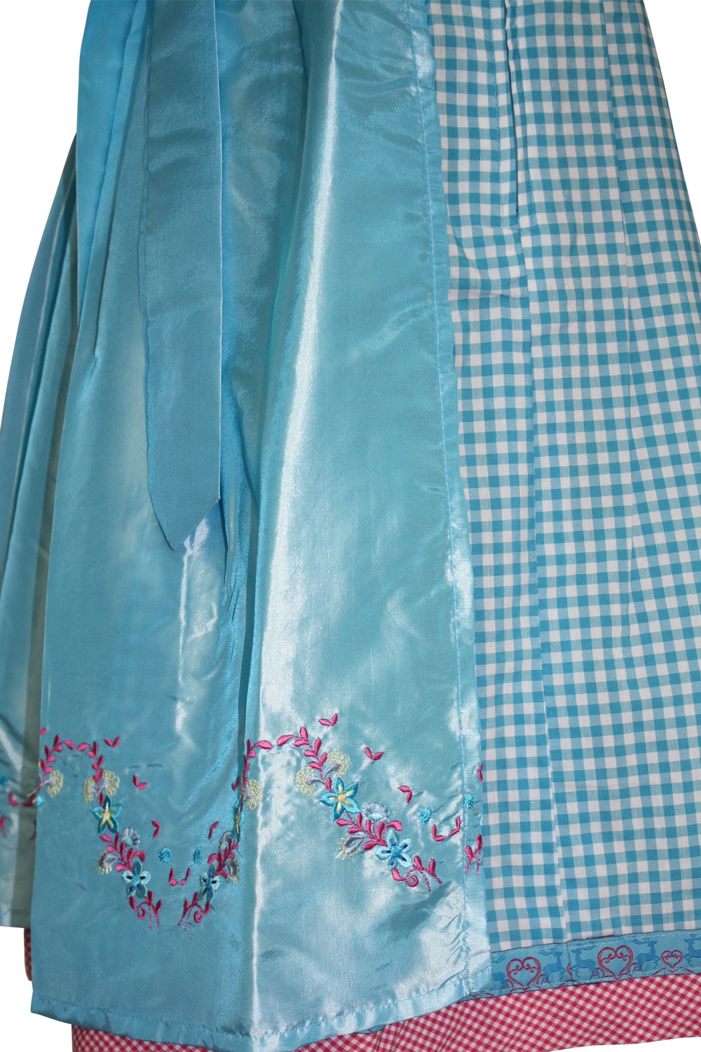 Dieses kurze Dirndl in Türkis und Rosa bringt Frische in den Kleiderschrank. Während das türkise Karomuster das gesamte Outfit dominiert, befinden sich rosa Farbakzente am Saum des Dirndls und der Schnürung im Dekolletébereich. Das Mieder wird zusätzlich von einer hübschen Blumenstickerei und Rüschen am oberen Saum geziert. Die türkisfarbene Schürze mit ihrer filigranen Bestickung im unteren Bereich rundet die harmonische Komposition des Outfits ab.