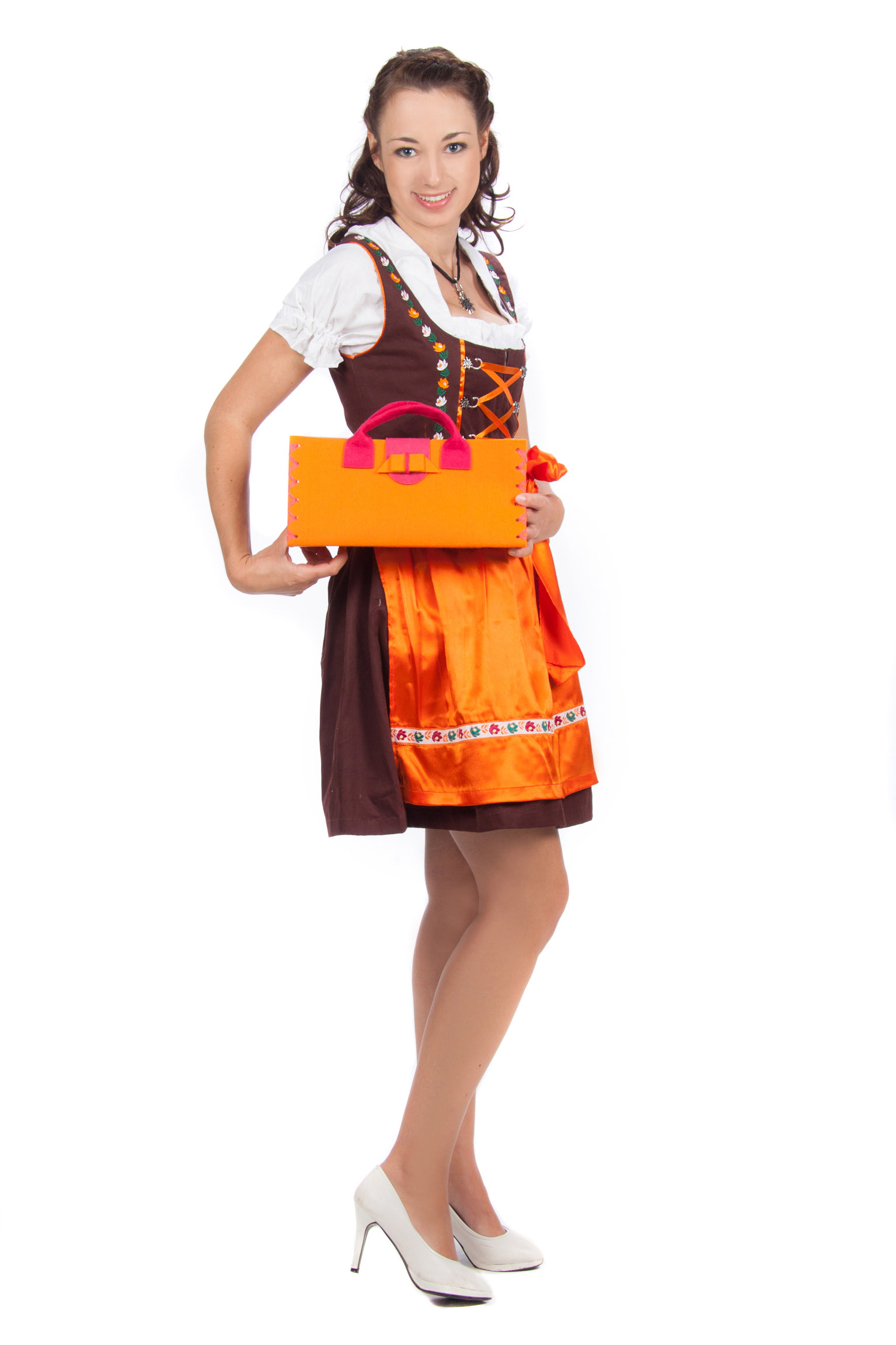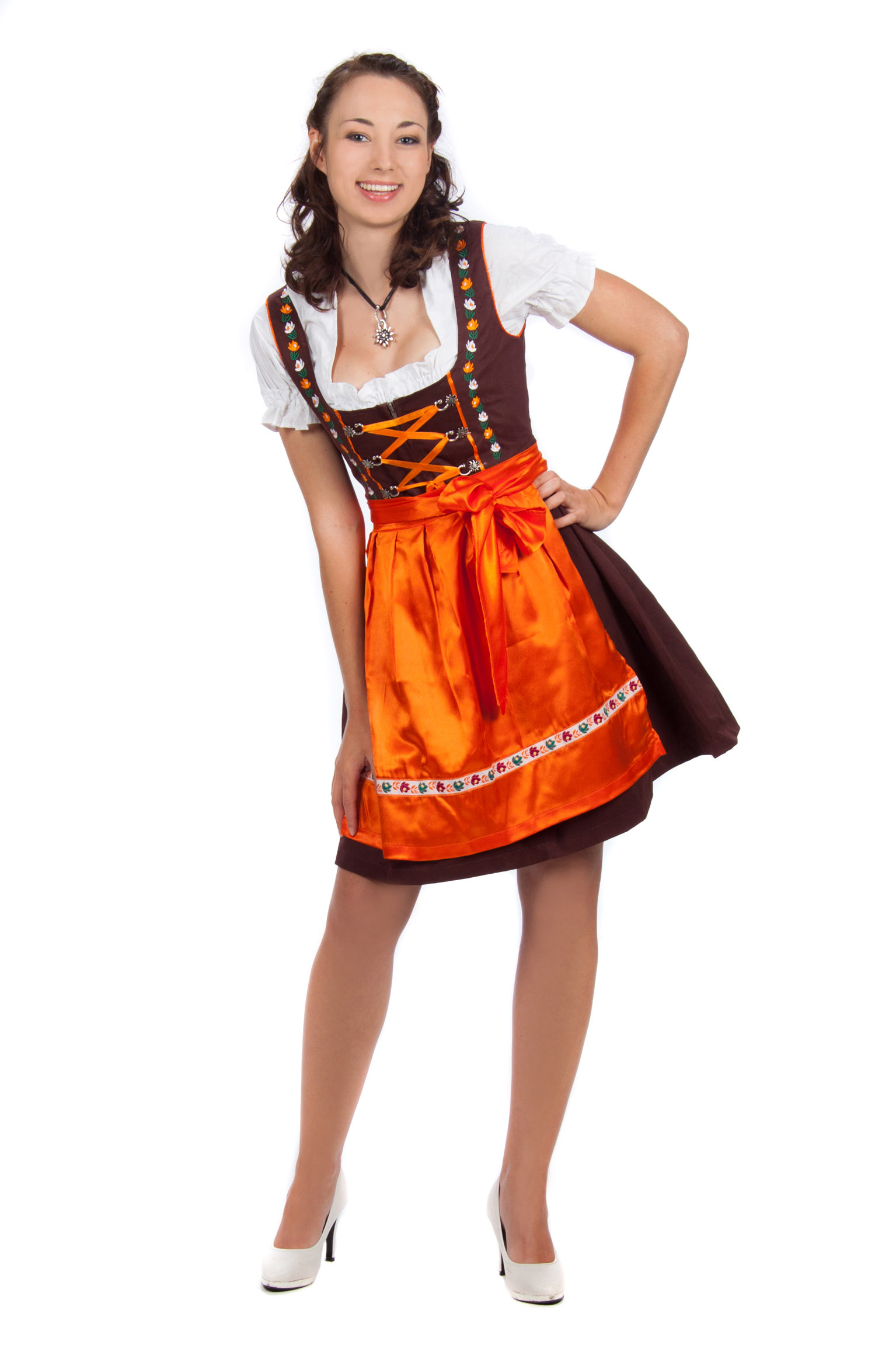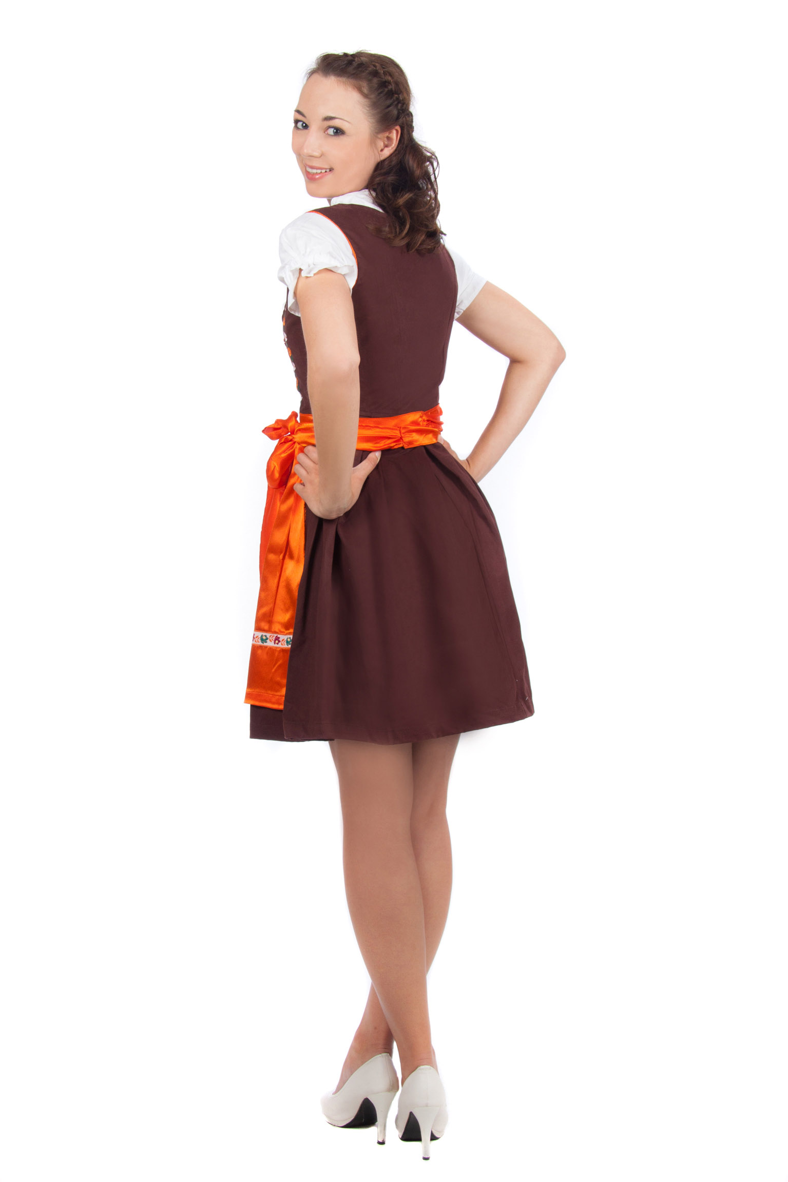 3-teiliges Dirndl in braun, passender orangefarbener Schürze und weißer Spitzen Dirndlbluse