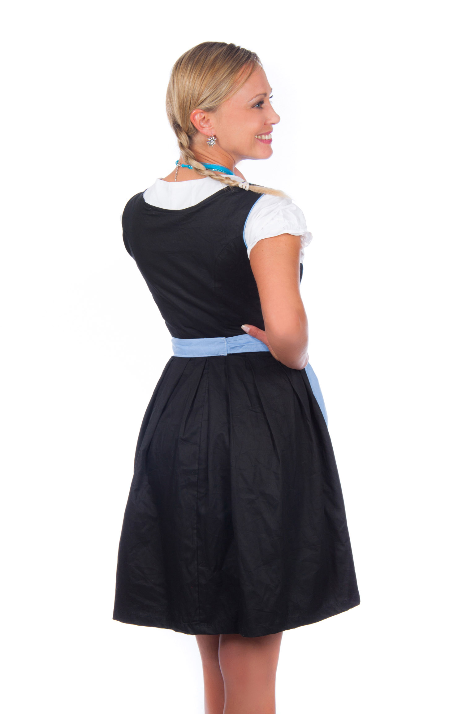 3-teiliges Dirndl in schwarz mit blauer Stickerei, passender blauer Schürze und weißer Dirndlbluse
