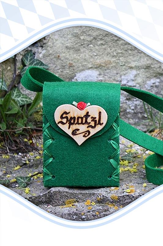 Ein handgearbeitetes Holzherz mit dem Schriftzug Spatzl befindet sich auf dem Verschluss der Filz Dirndltasche - Jedes Herz ist ein Einzelstück!
