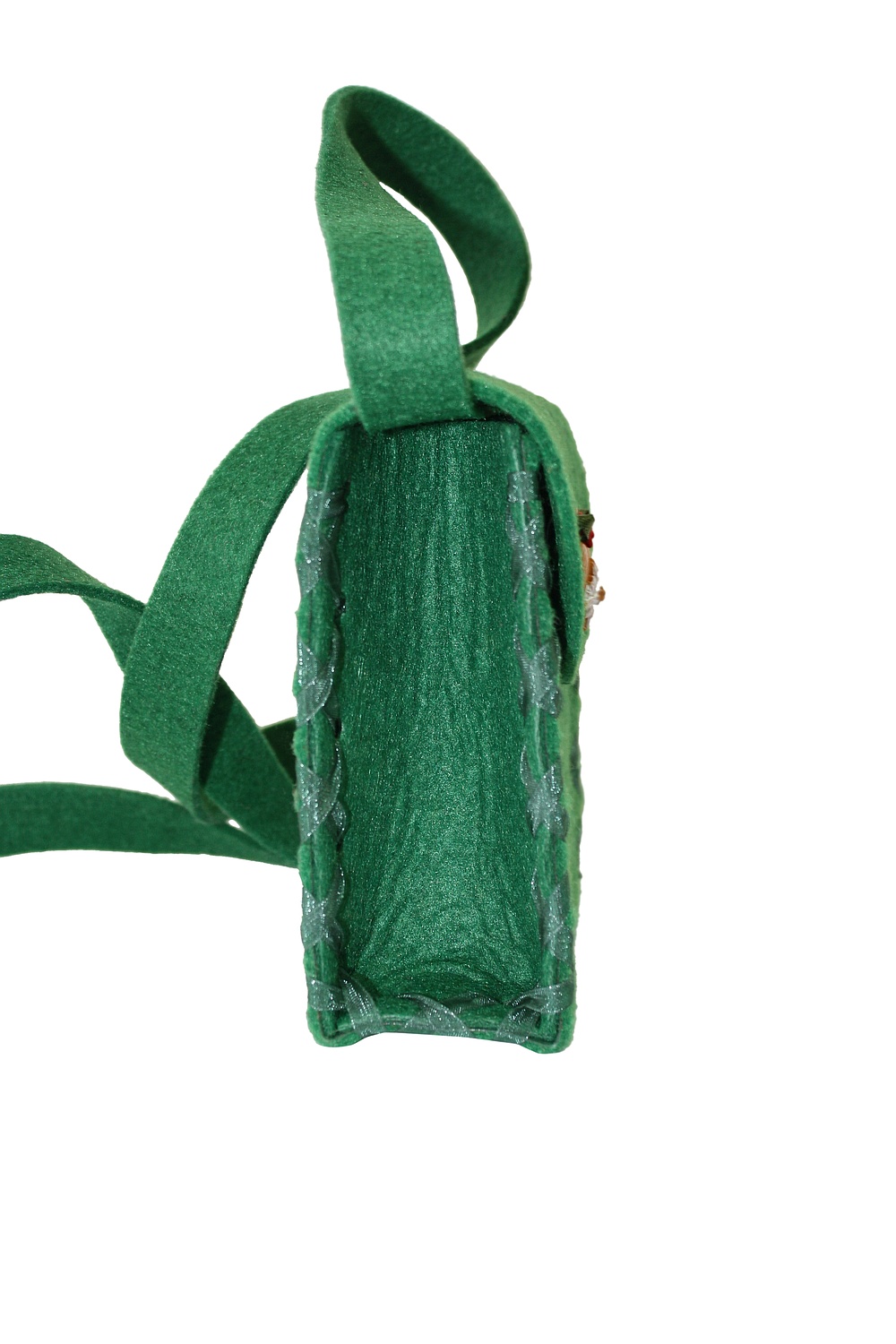 Handgefertigte Mini Dirndl Umhängetasche aus Filz in der Farbe grün.