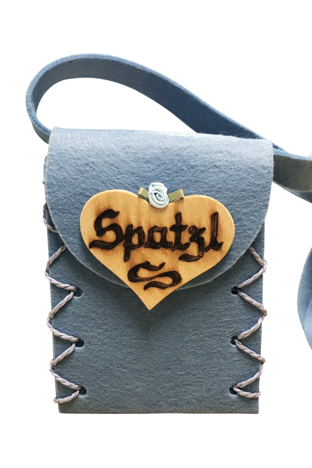 Ein handgearbeitetes Holzherz mit dem Schriftzug Spatzl befindet sich auf dem Verschluss der Dirndltasche - Jedes Herz ist ein Einzelstück!