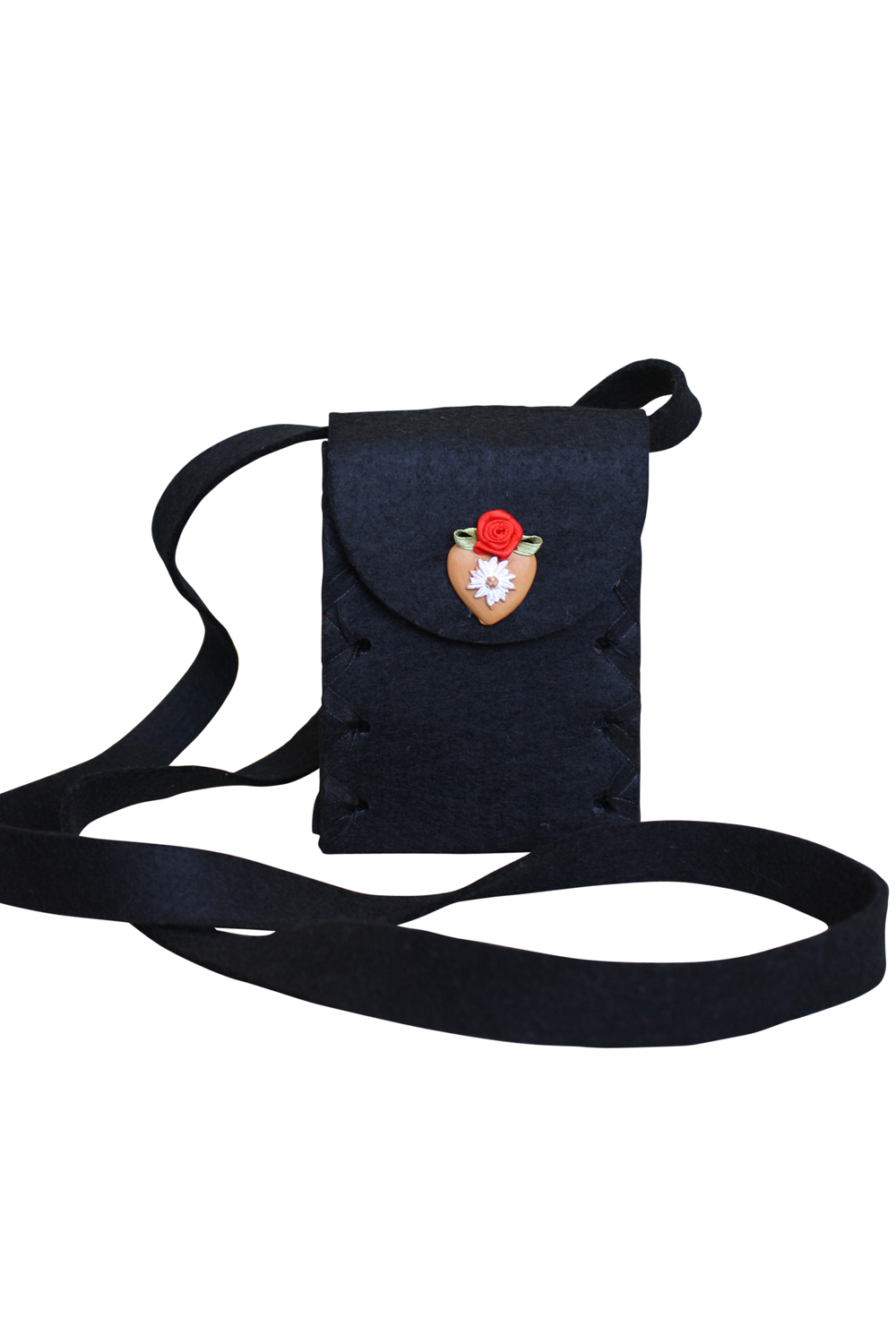 Handgefertigte Mini Dirndl Umhängetasche aus Filz in der Farbe schwarz.