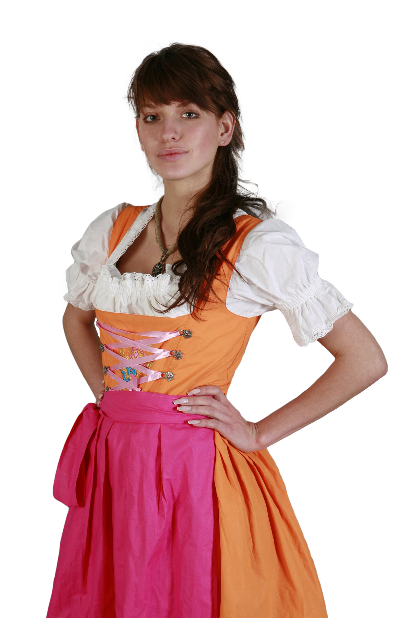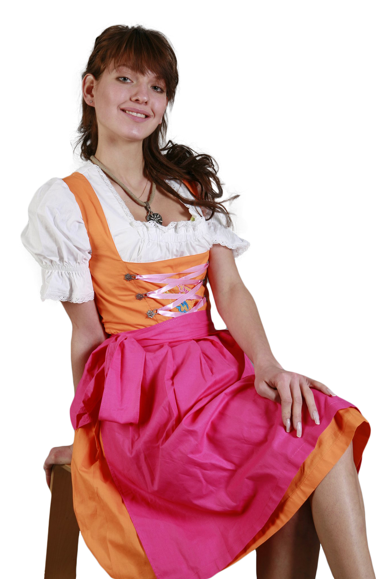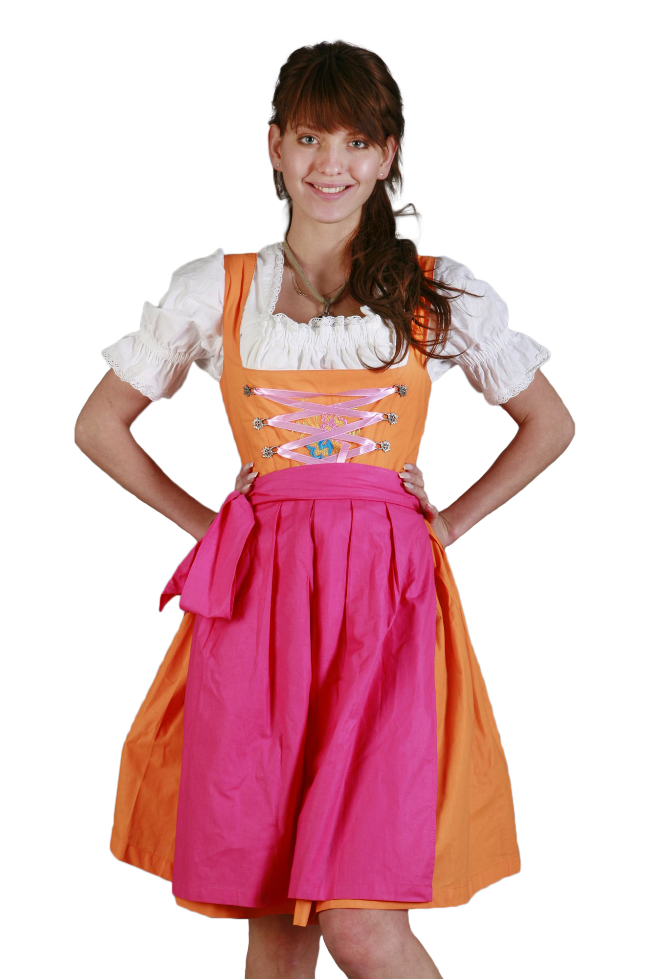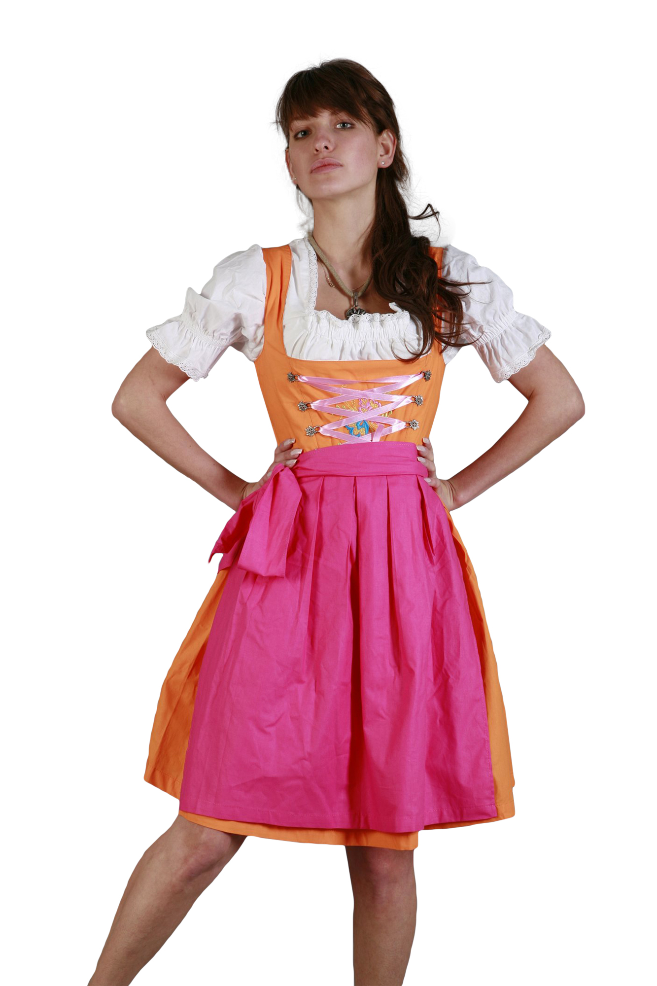 Sexy 3-teiliges Dirndl in orange mit passender pinker Schürze und weißer spitzen Dirndlbluse