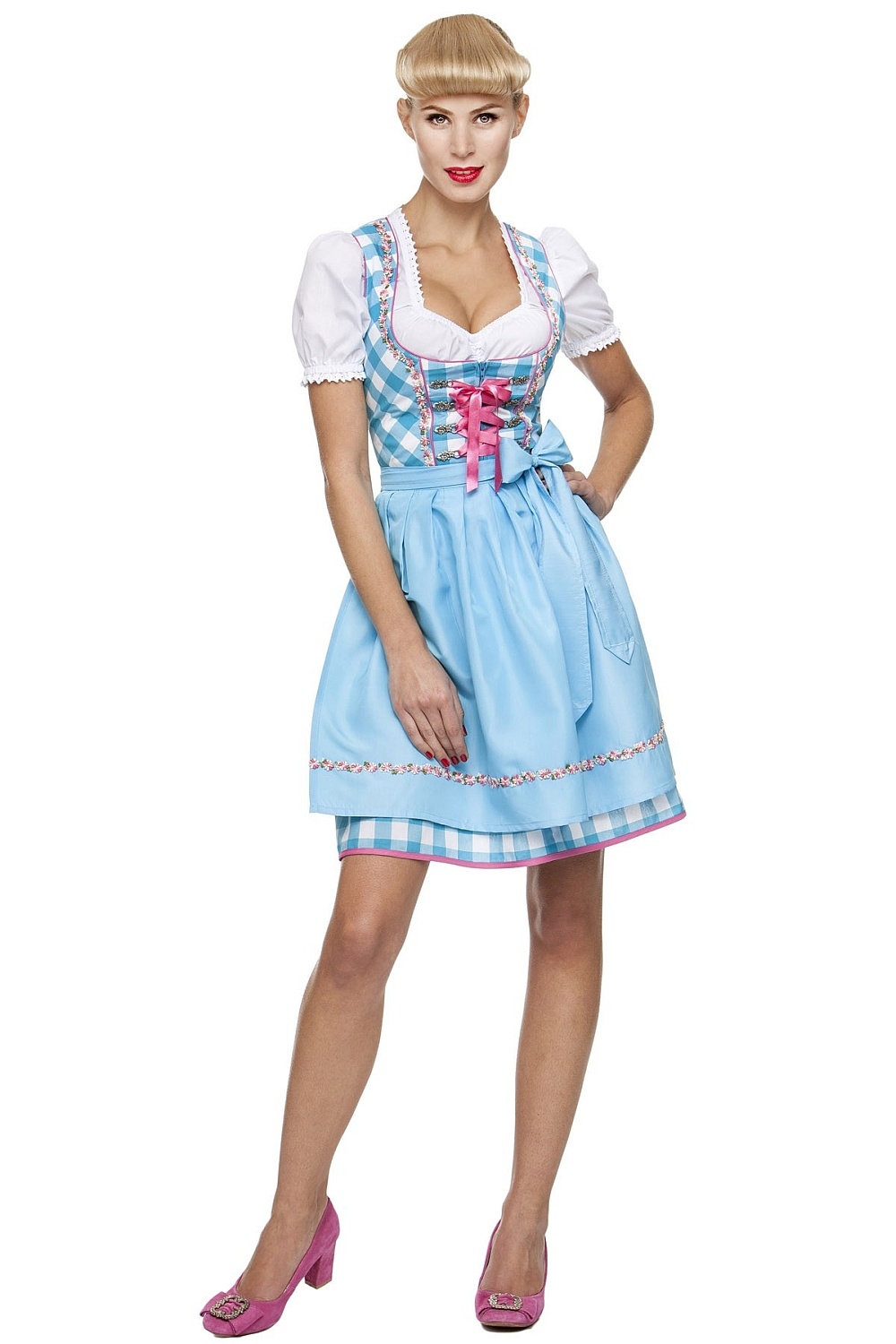 Türkises Mini Dirndl, im Block-Karo Design. Besonders hübsch: Die liebevoll gestickte rosa und weiße Blümchenborte, welche das Oberteil schmückt . Dieses hübsche Detail findet sich auch auf der Schürze wieder. Pinke Paspeln am Oberteil und am Rocksaum , sowie die pinke Satinschnürung kontrastieren perfekt zur Grundfarbe. Holen Sie sich jetzt dieses sexy Designer Dirndl zum absoluten schnäppchen Preis!