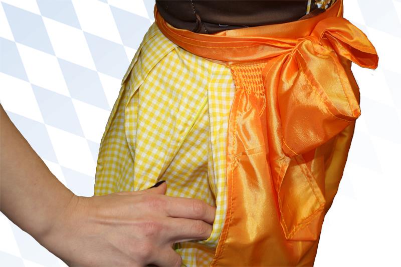Die leicht glänzende orange Dirndlschürze passt perfekt zum gelb-weiß karierten Rock