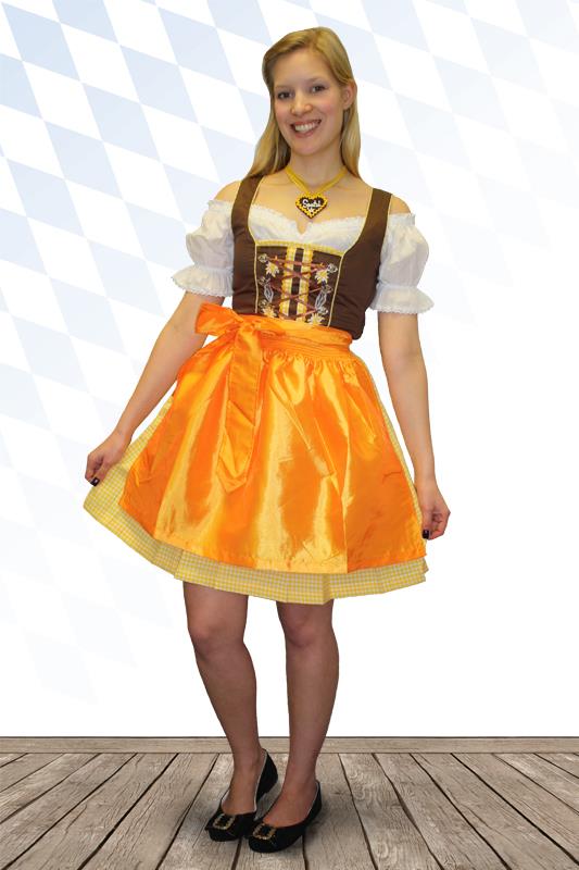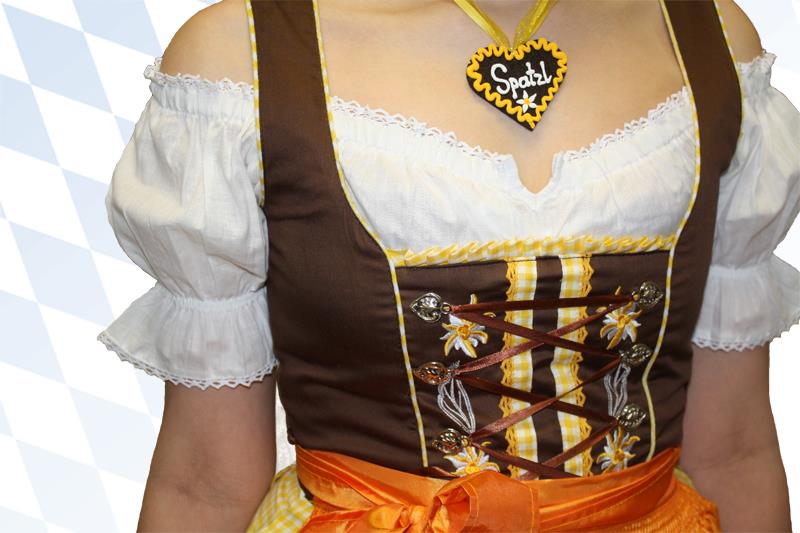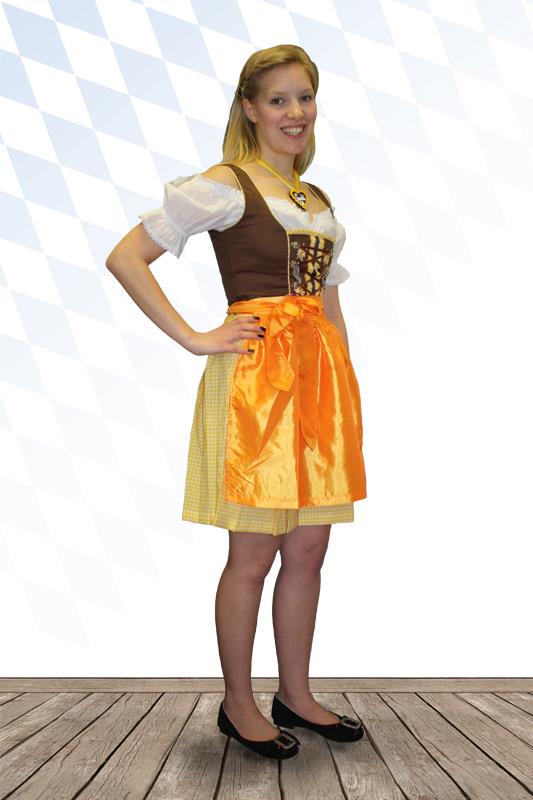 3-teiliges Dirndl mit braunem Oberteil, gelbweiß karierten Rock, passender oranger Schürze und weißer Spitzen Carmen Dirndlbluse