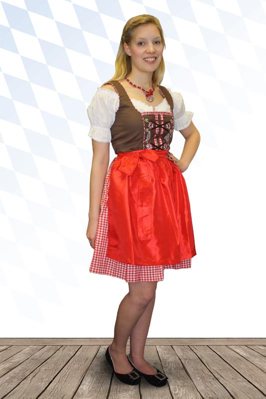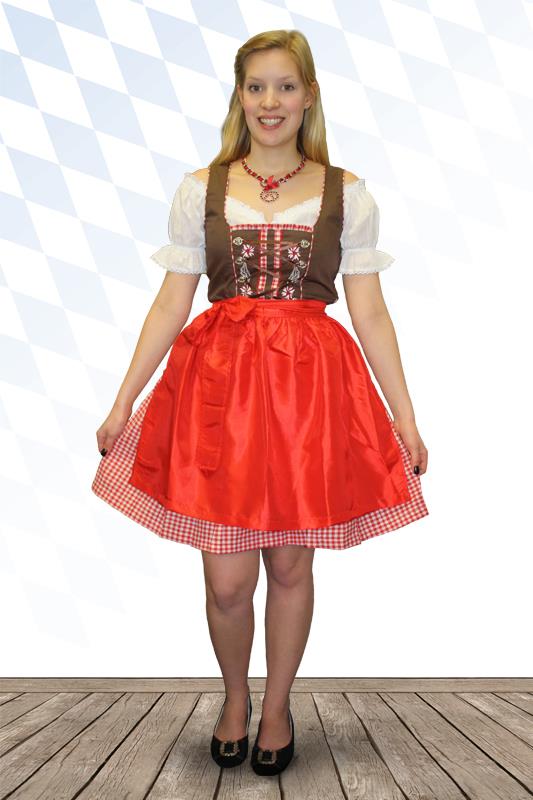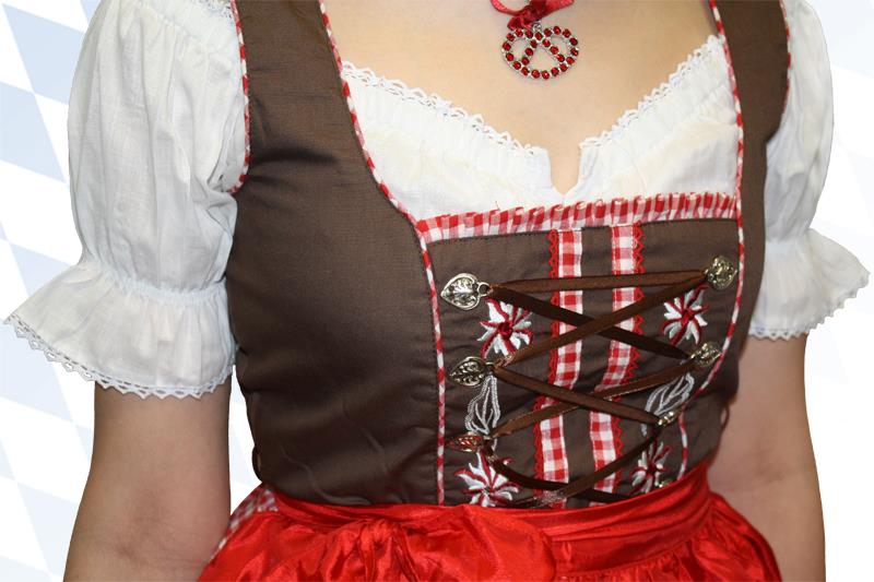 3-teiliges Dirndl mit braunem Oberteil, rot weiß karierten Rock, passender roter Schürze und weißer Spitzen Carmen Dirndlbluse