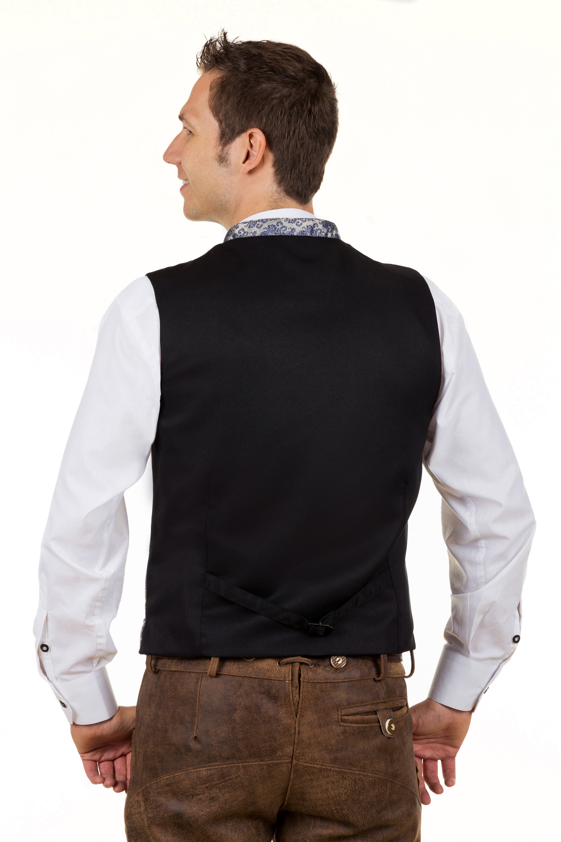 Die zwei Hüfttaschen sowie die Brusttasche bieten genug Platz für dies und das. Silber farbene Kugel Knöpfe runden den edlen Trachtenlook der Weste ab.