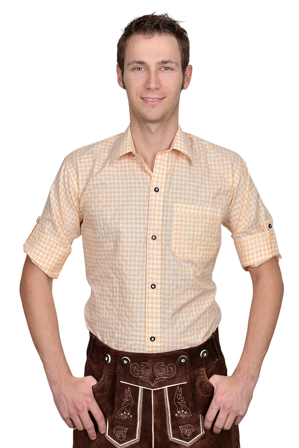 Trachtenhemd hellorange weiß kariert mit stilechten Trachtenknöpfen.