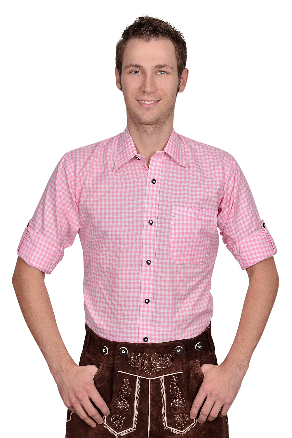 Trachtenhemd aus 100% feinster Baumwolle rosa weiß kariert mit stilechten Trachtenknöpfen.