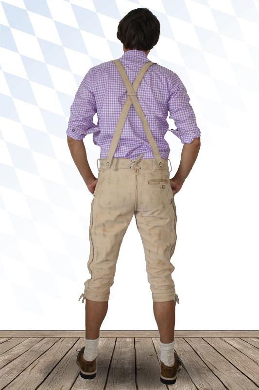 Die Trachtenlederhose hat eine Gesäßtasche, 2 Taschen vorne, eine Messertasche an der Seite sowie eine sehr schöne Knopfleiste aus hochwertigen Trachtenknöpfen links und rechts an den Beinenden außen.
