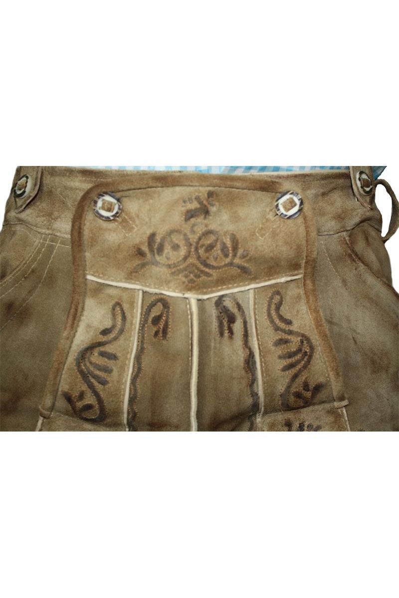 Hochwertige Trachtenknöpfe schließen den Latz. Zu dieser Lederhose erhalten Sie ausserdem die passenden Hosenträger, welche individuell auf Ihre Größe eingestellt werden können.