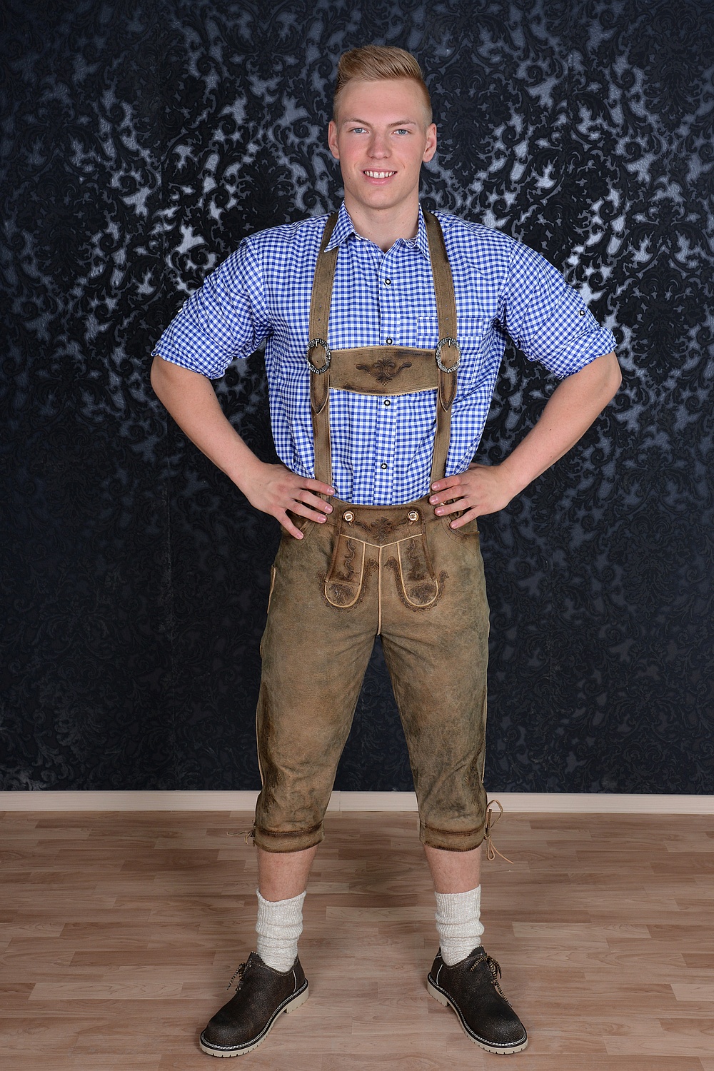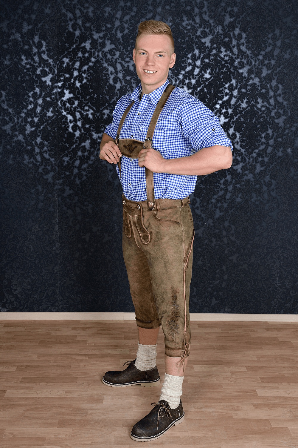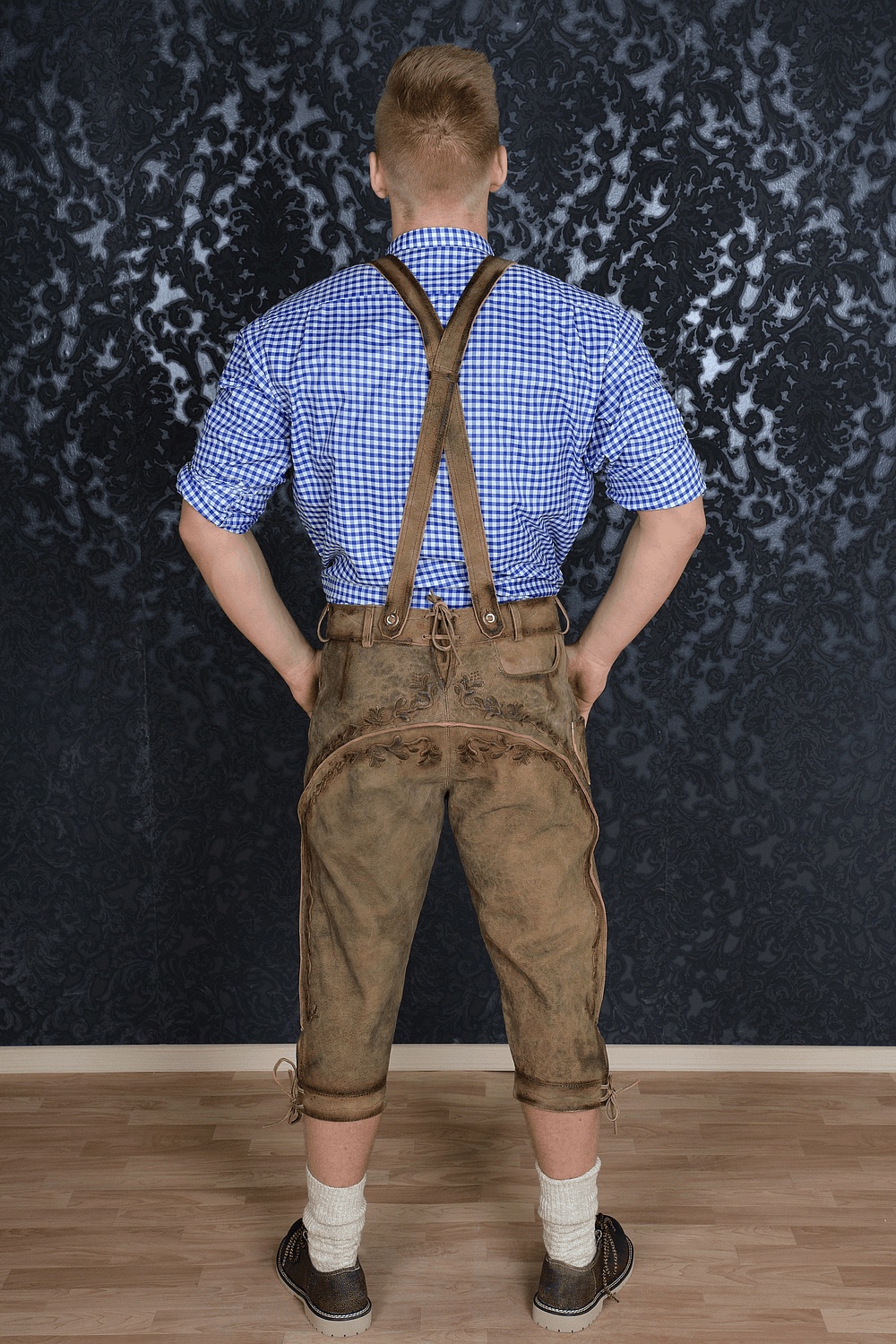 Hochwertige Trachtenknöpfe schließen den Latz. Im Lieferumfang enthalten sind außerdem passende Hosenträger, die individuell auf Ihre Größe eingestellt werden können.