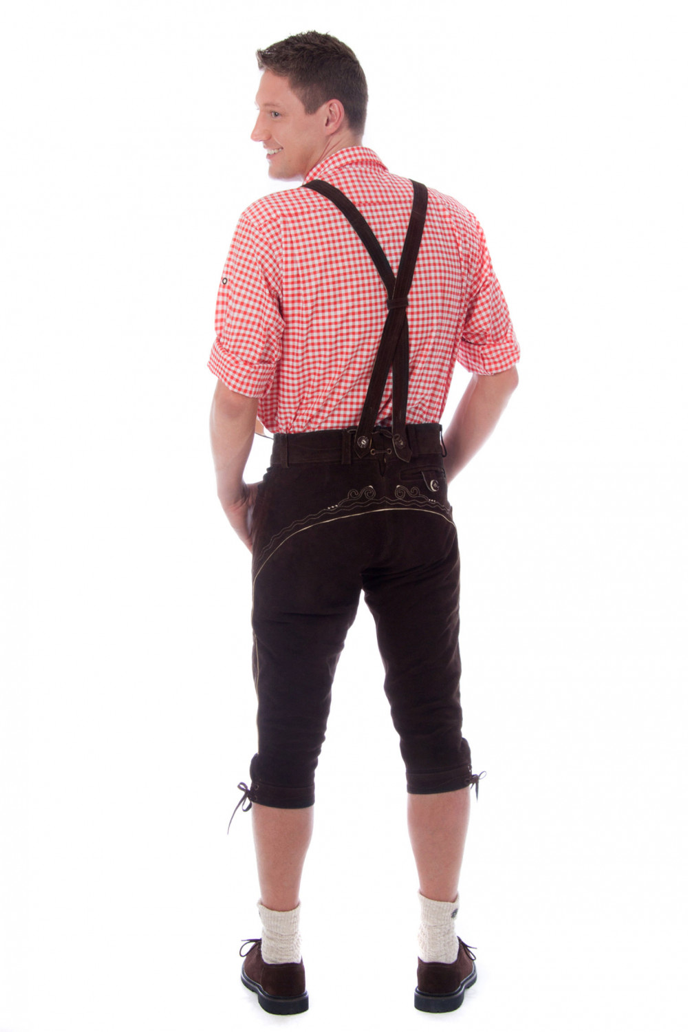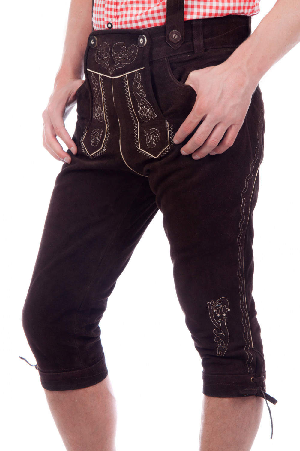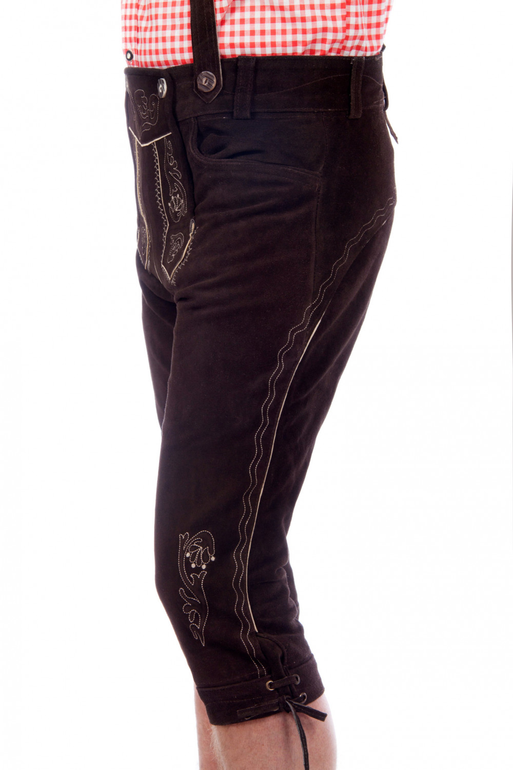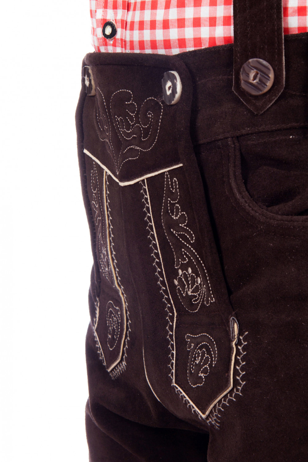 1. Kniebundlederhose dunkelbraun mit Hosenträgern aus feinstem Veloursleder